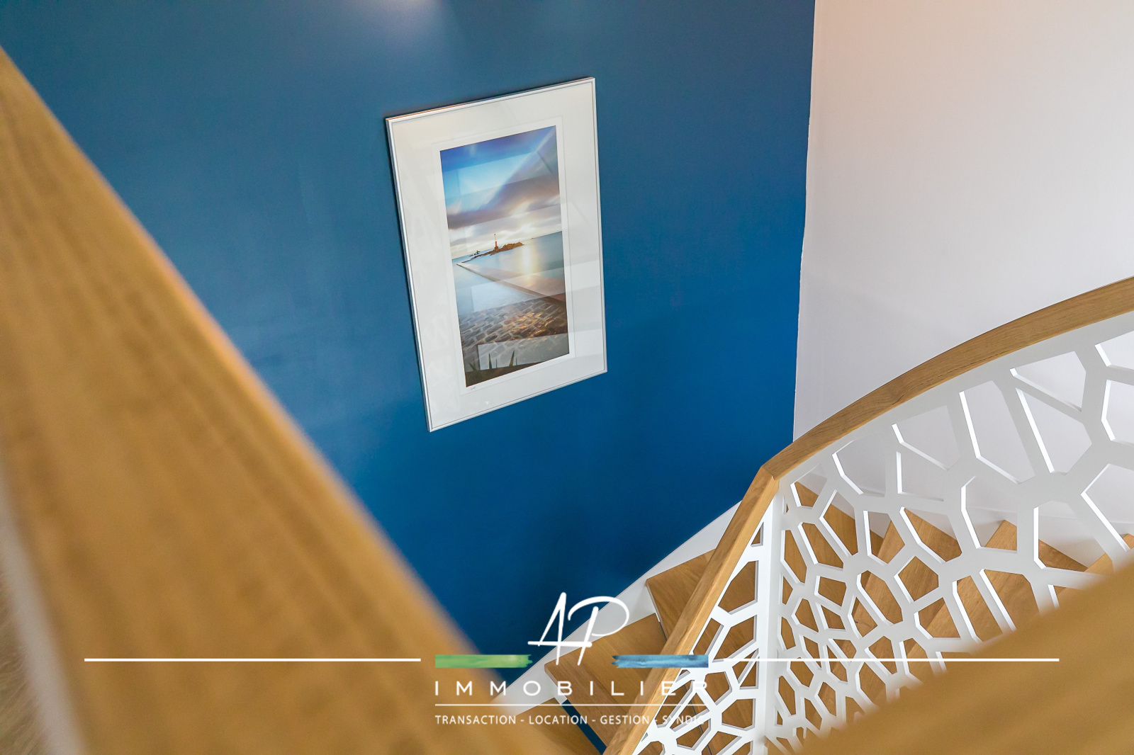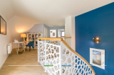 Elle comprend au rez-de-chaussée une entrée avec un superbe escalier de menuisier, une pièce de vie avec cuisine semi-ouverte sur le séjour/salon, une suite parentale avec salle d'eau, un WC indépendant et un petit cellier. A l’étage, une grande mezzanine distribue deux chambres avec placards, un WC, une salle de bains et une pièce borgne isolée et plaquée de 25m² permettant de faire une 4ème chambre à moindre coût (devis à l'agence pour moins de 7.000€ avec installation de deux fenêtres de toit de 114 x118 avec volets roulants solaires, peinture et sol).