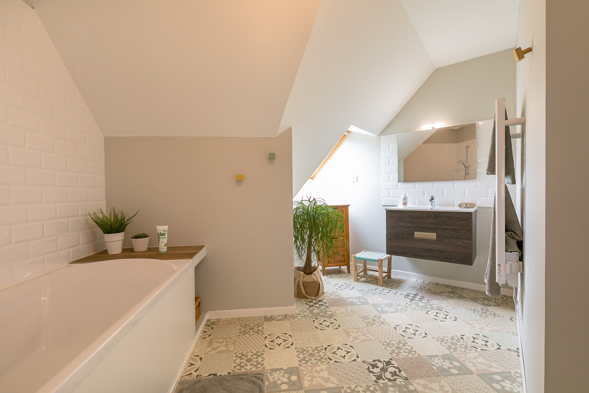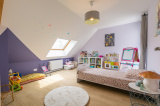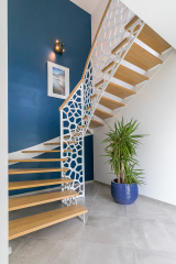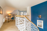 Elle comprend au rez-de-chaussée une entrée avec un superbe escalier de menuisier, une pièce de vie avec cuisine semi-ouverte sur le séjour/salon, une suite parentale avec salle d'eau, un WC indépendant et un petit cellier. A l’étage, une grande mezzanine distribue deux chambres avec placards, un WC, une salle de bains et une pièce borgne isolée et plaquée de 25m² permettant de faire une 4ème chambre à moindre coût (devis à l'agence pour moins de 7.000€ avec installation de deux fenêtres de toit de 114 x118 avec volets roulants solaires, peinture et sol).