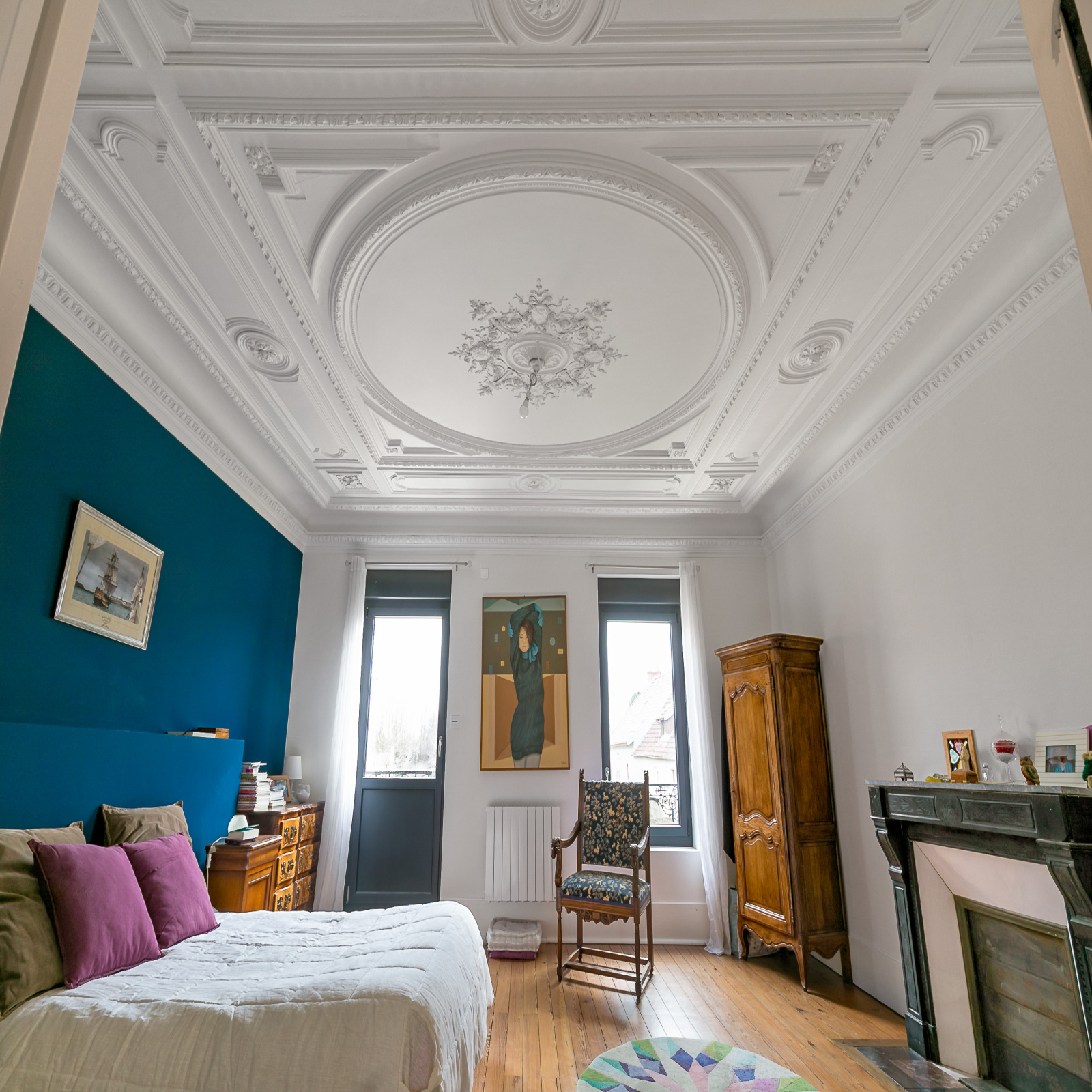 Au premier étage le palier distribue trois belles chambres dont la plus grande vous séduira par son magnifique plafond mouluré, une salle de bain avec douche et baignoire et un wc indépendant.