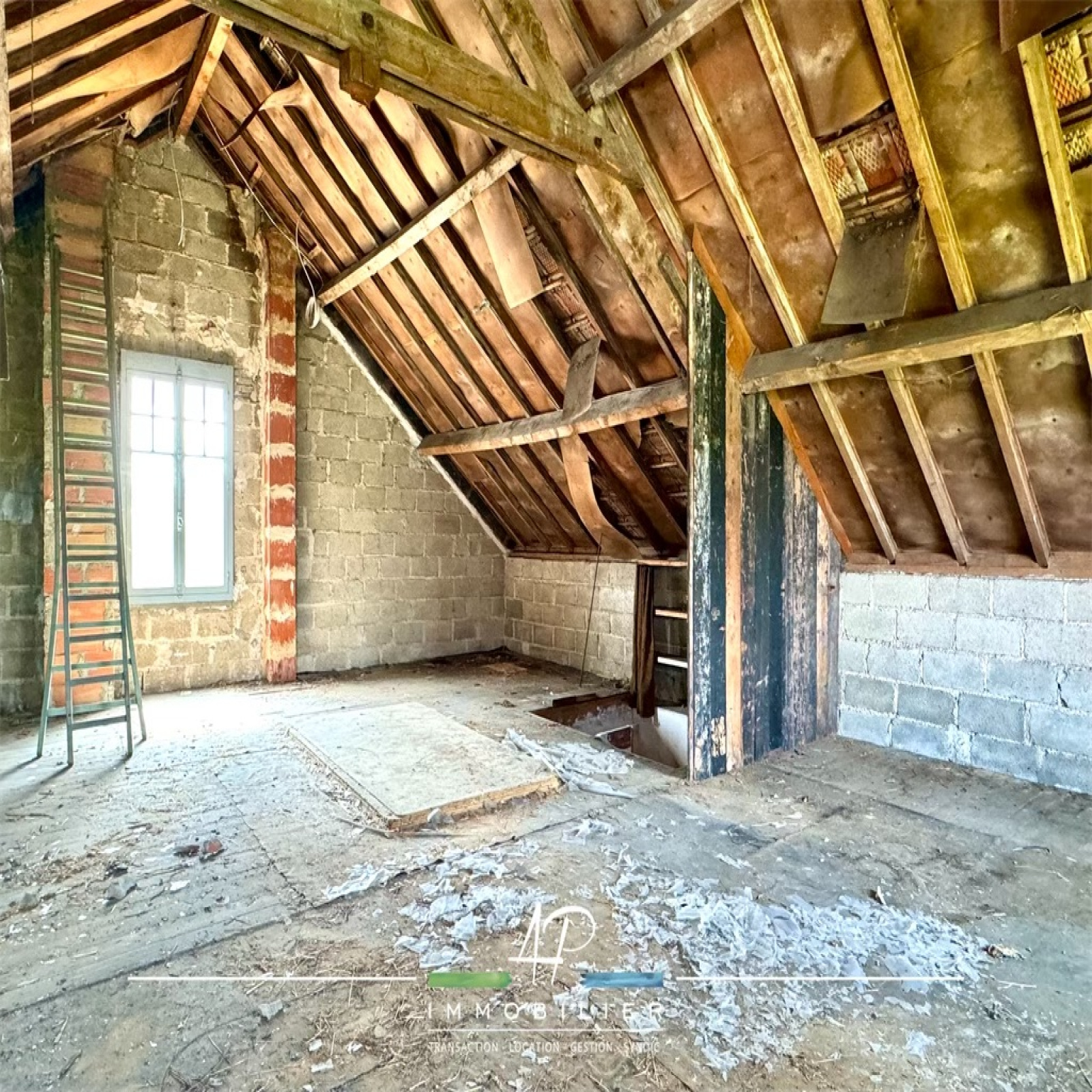 L’étage, à usage de grenier, pourra être aménagé sans gros travaux puisque la trémie est déjà existante avec un escalier 1/4 tournant en bois, le plancher est en bon état et les ouvertures sont existantes (3 fenêtres).