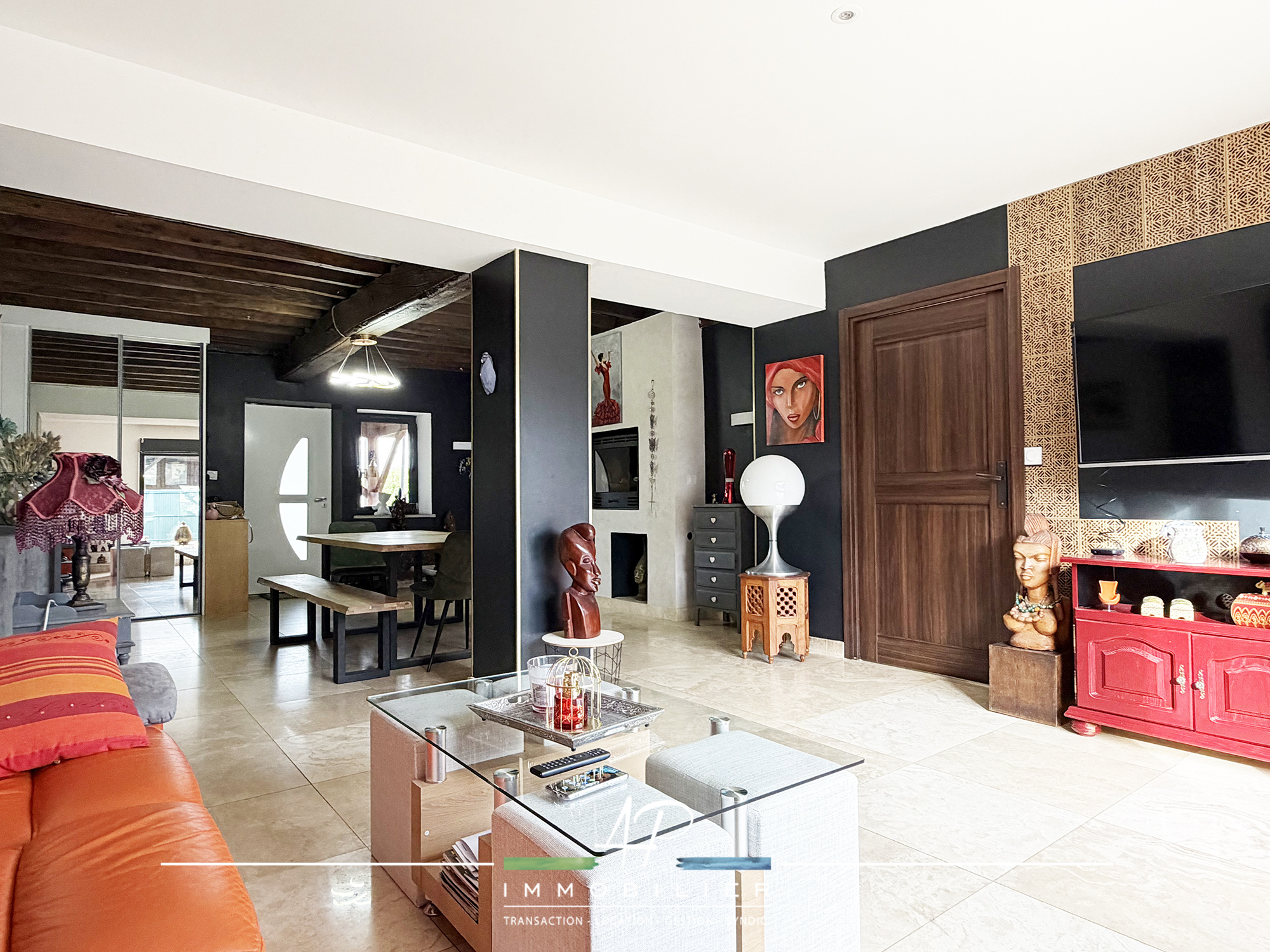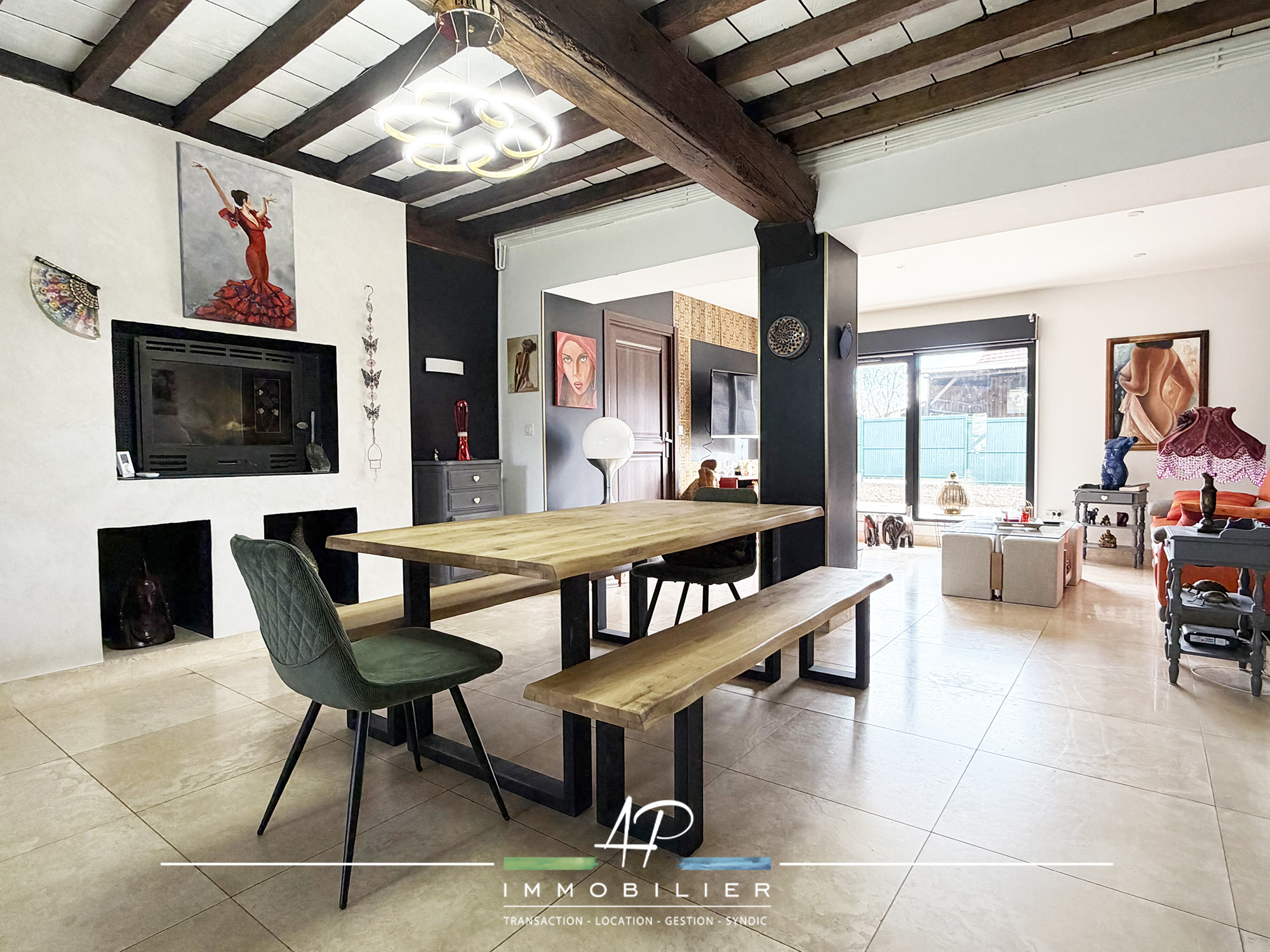 - Un vaste séjour lumineux de 42 m² avec cheminée à foyer fermé Godin