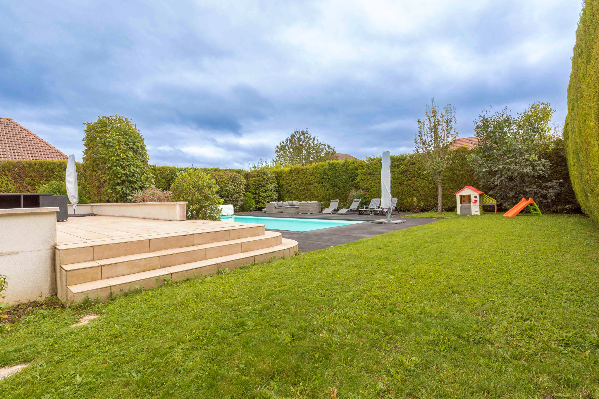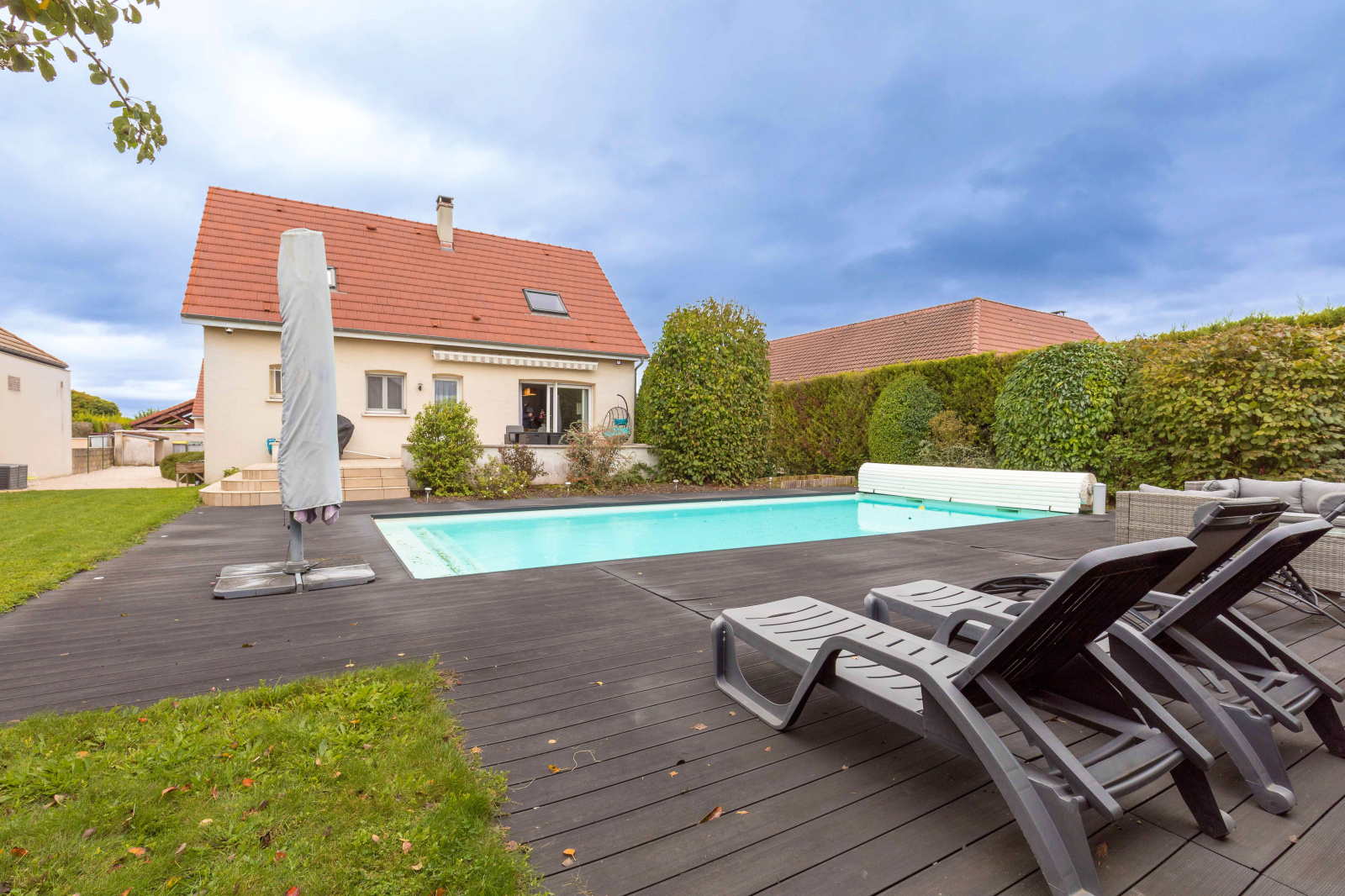 À l'extérieur, un jardin arboré de 825 m2, une terrasse carrelée exposée ouest et une piscine 5X10 et son aménagement en terrasse composite.
