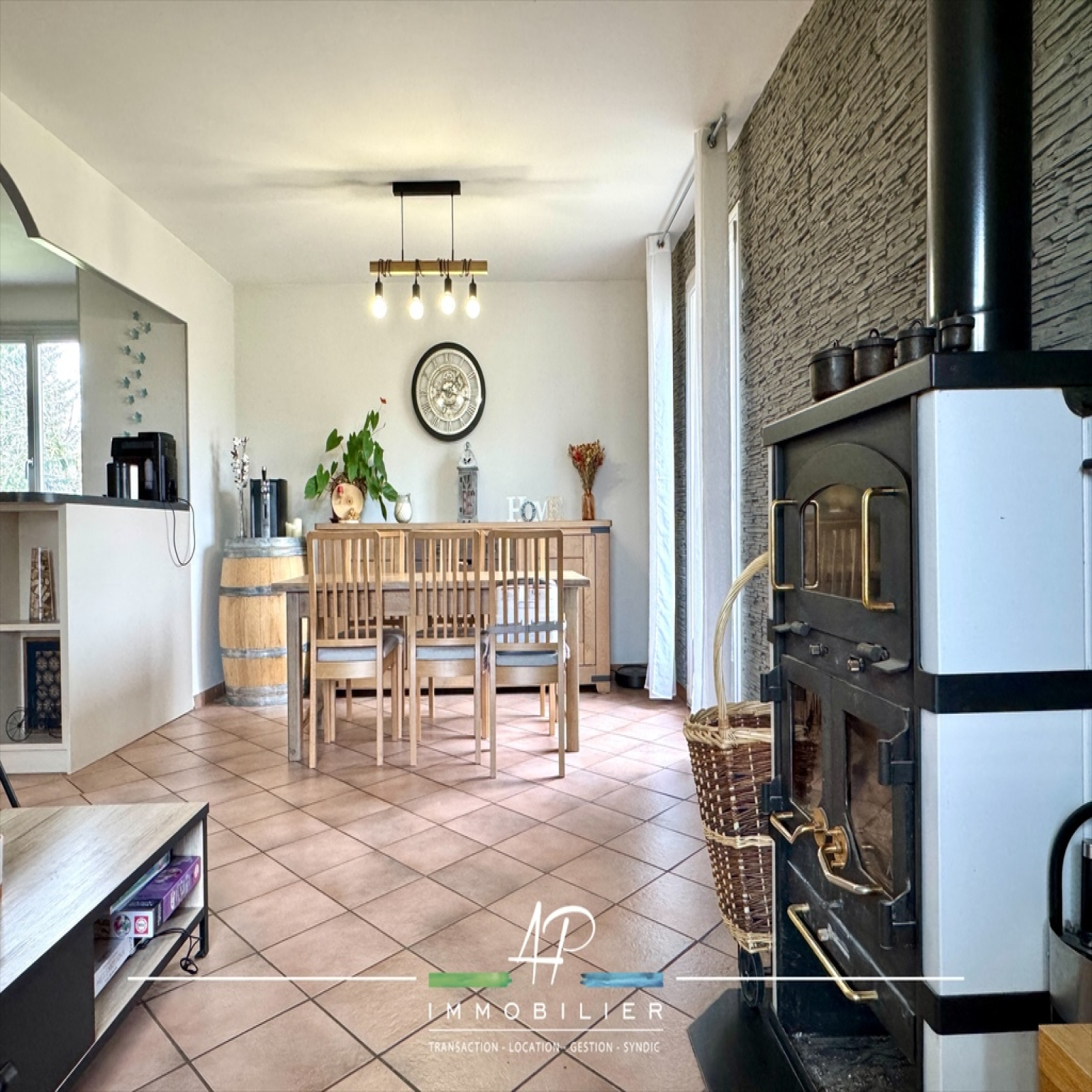 Le mode de chauffage est mixte et composé d'un poêle à bois et de radiateurs éléctriques.