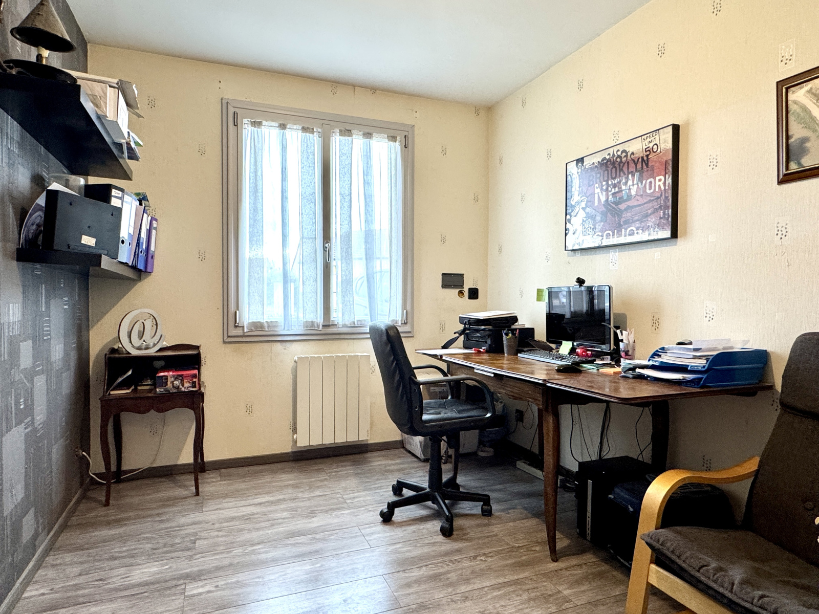 Le garage permet le stationnement d'une voiture et le grenier est aménagé en petit bureau.
