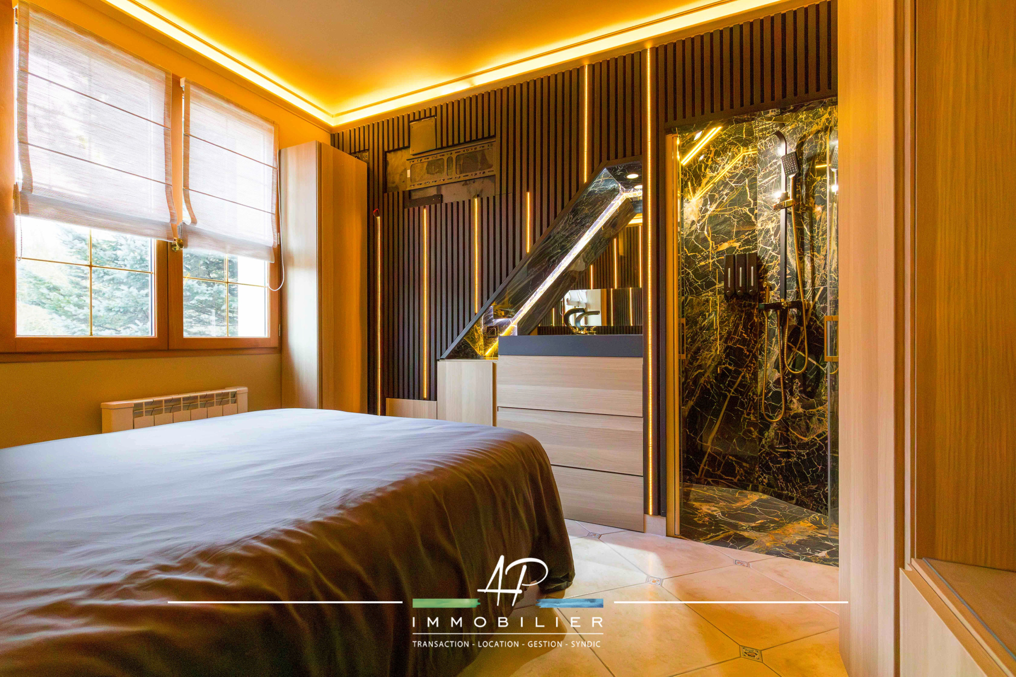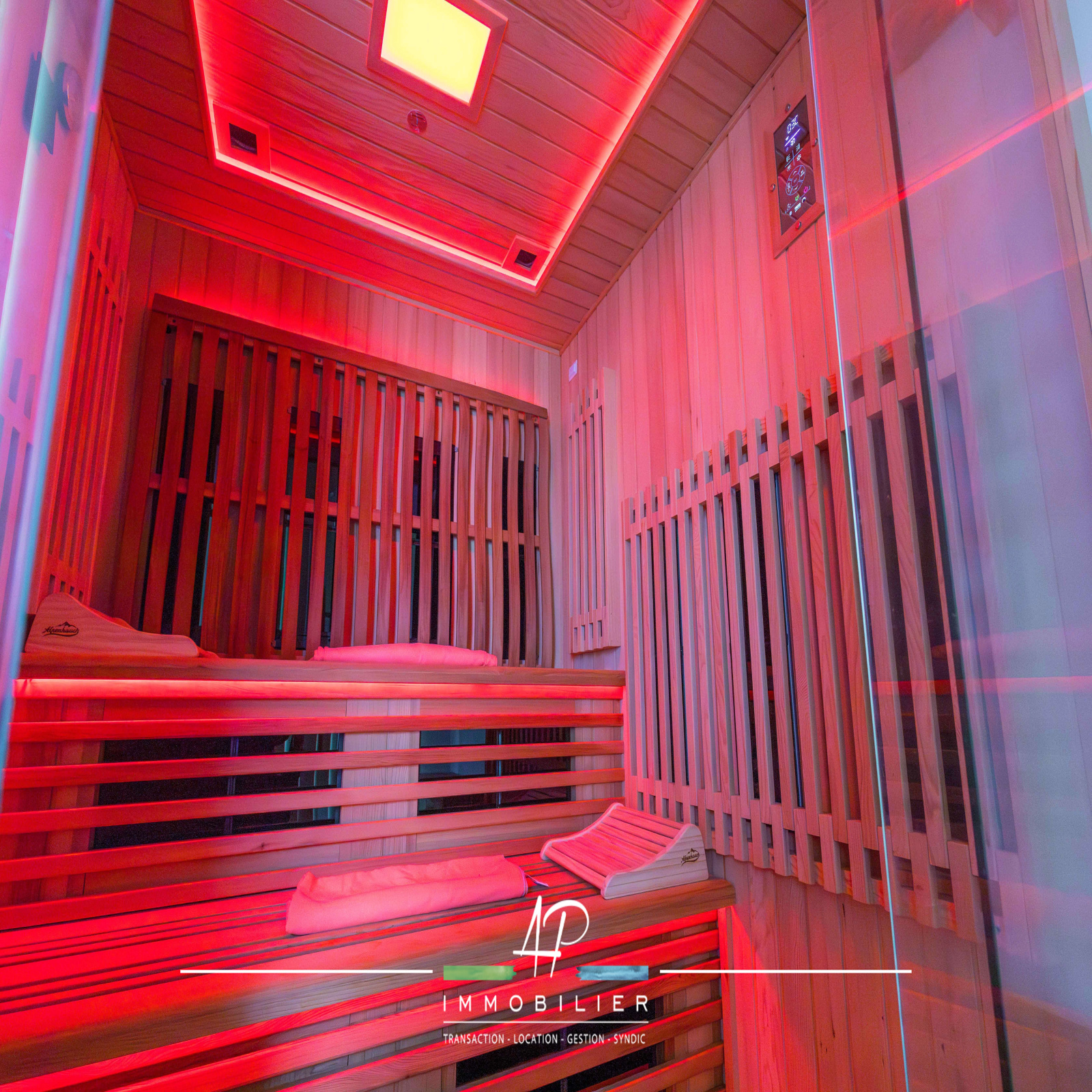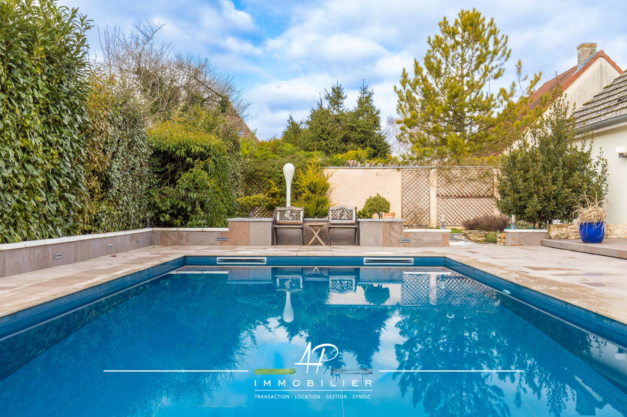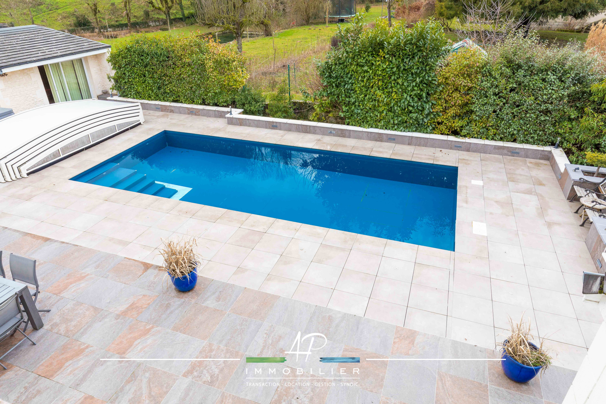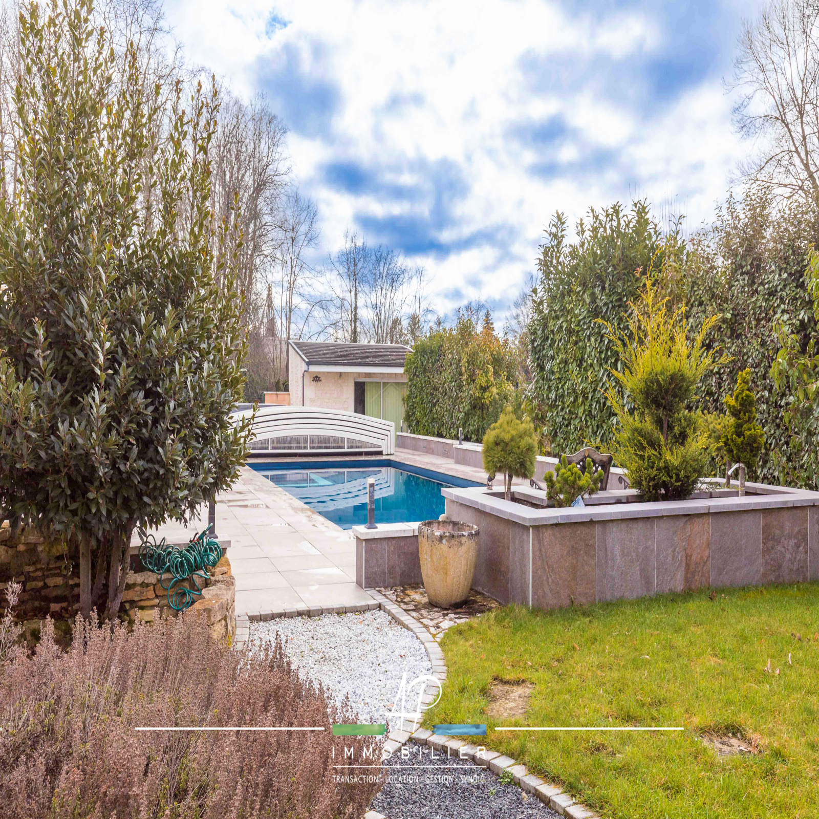 Les extérieurs ont été aménagés comme un espace de détente à part entière. Vous profiterez d’une grande terrasse exposée ouest, d’une piscine 4 x 10 mètres, ainsi que d’un espace bien-être avec sauna et jacuzzi. Une cour à l’avant permet un stationnement confortable.