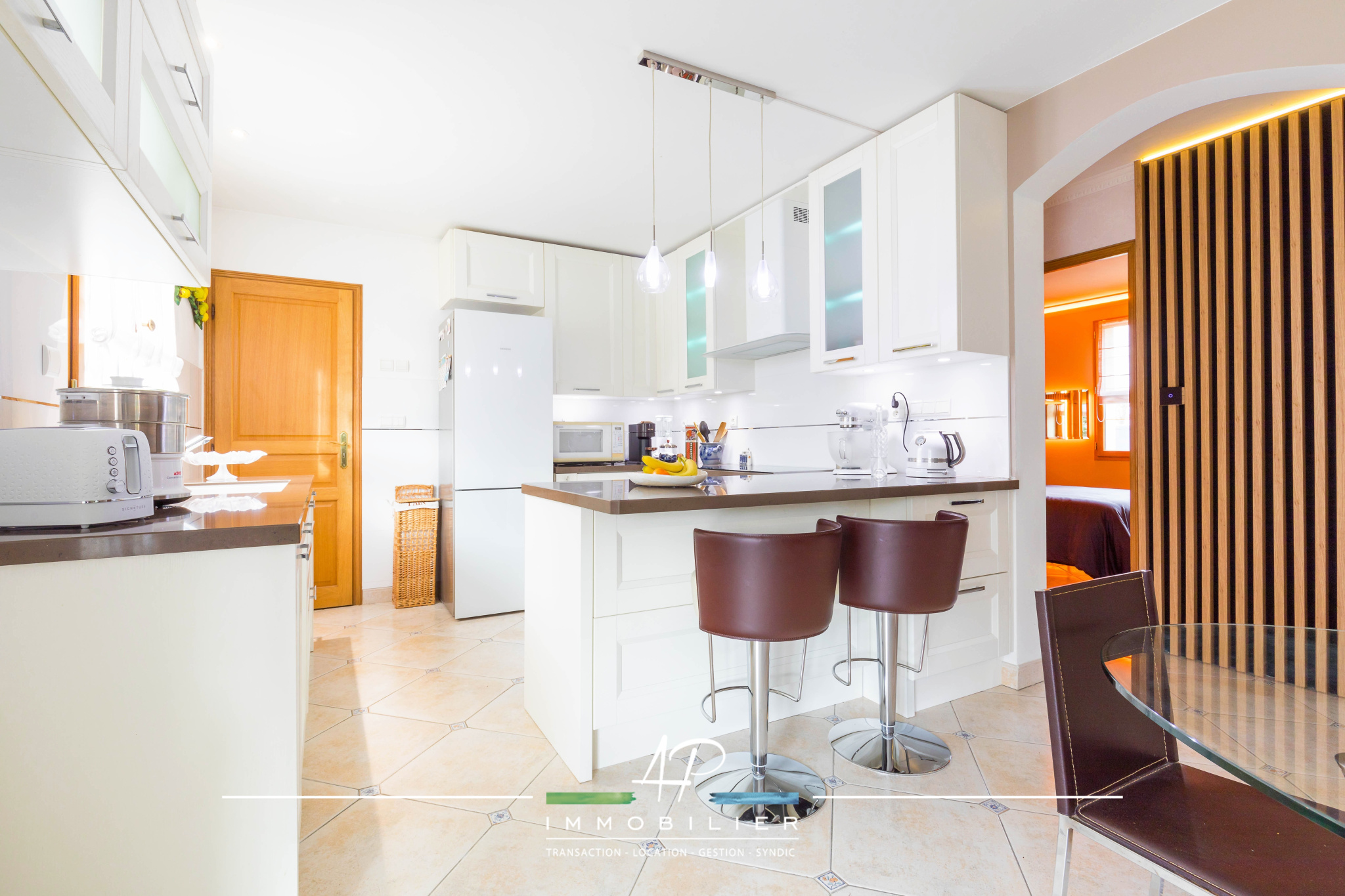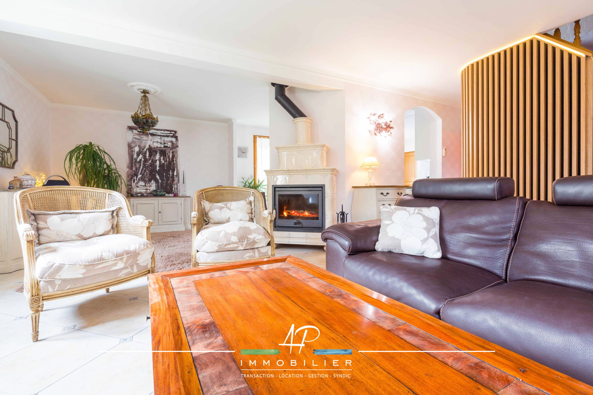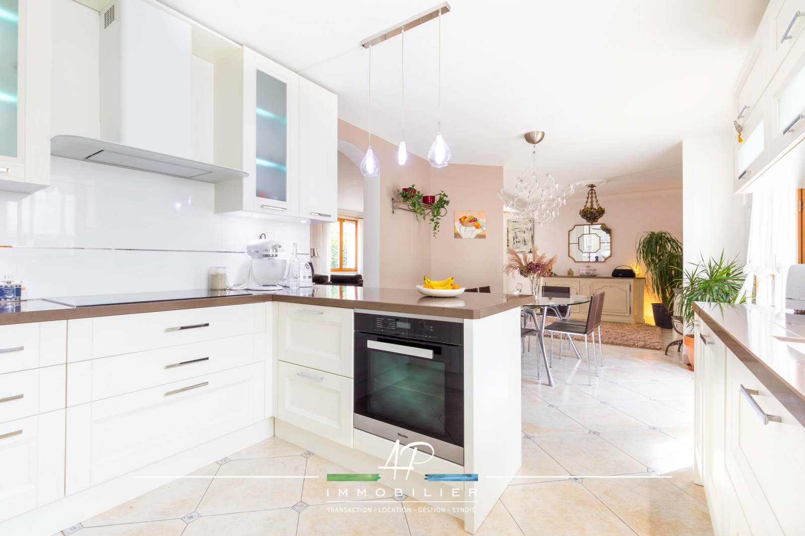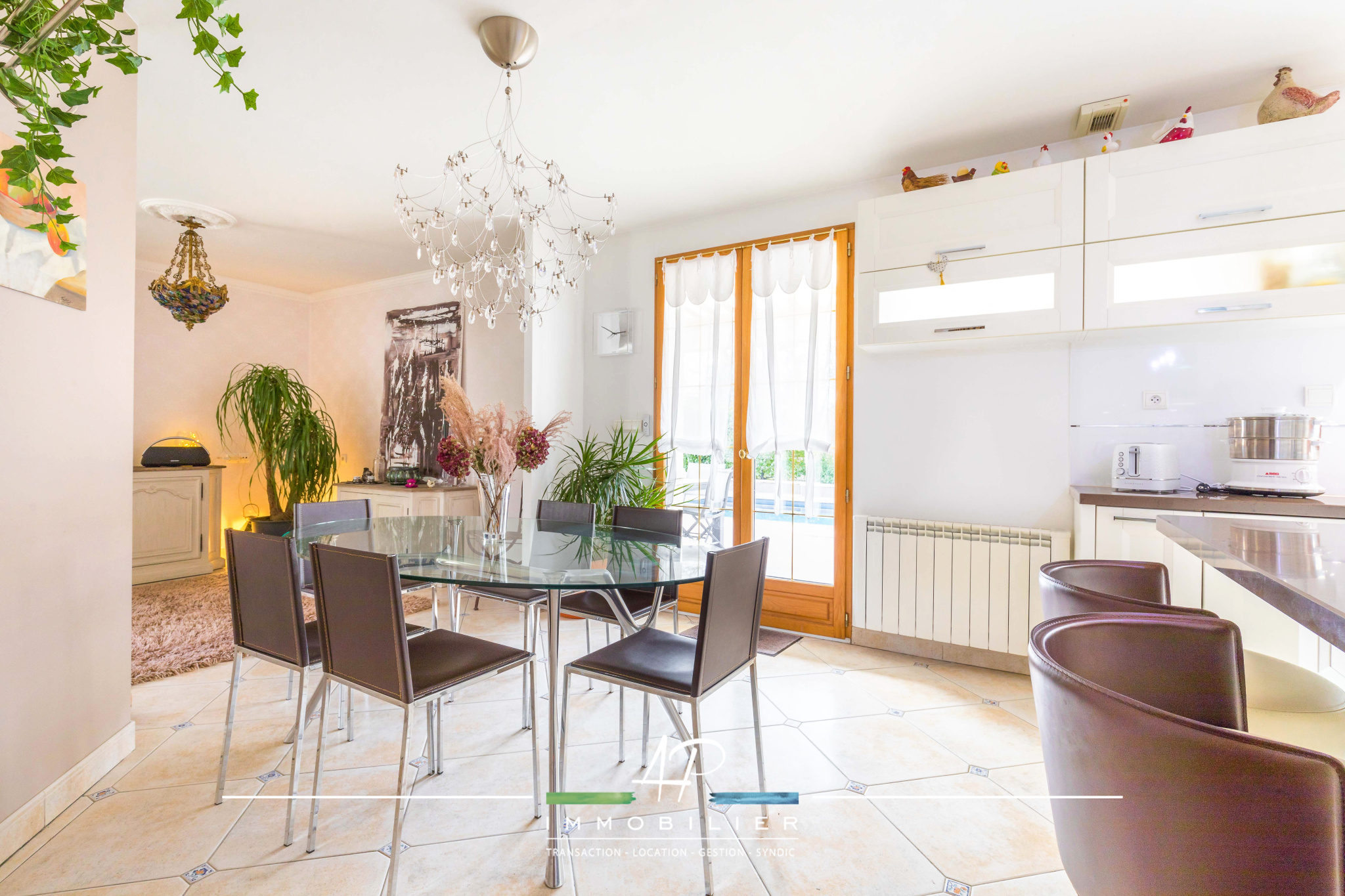 La pièce de vie est agréable et lumineuse, avec cuisine équipée ouverte d'une surface de 52 m², offrant volumes, convivialité et une belle ouverture sur la terrasse.