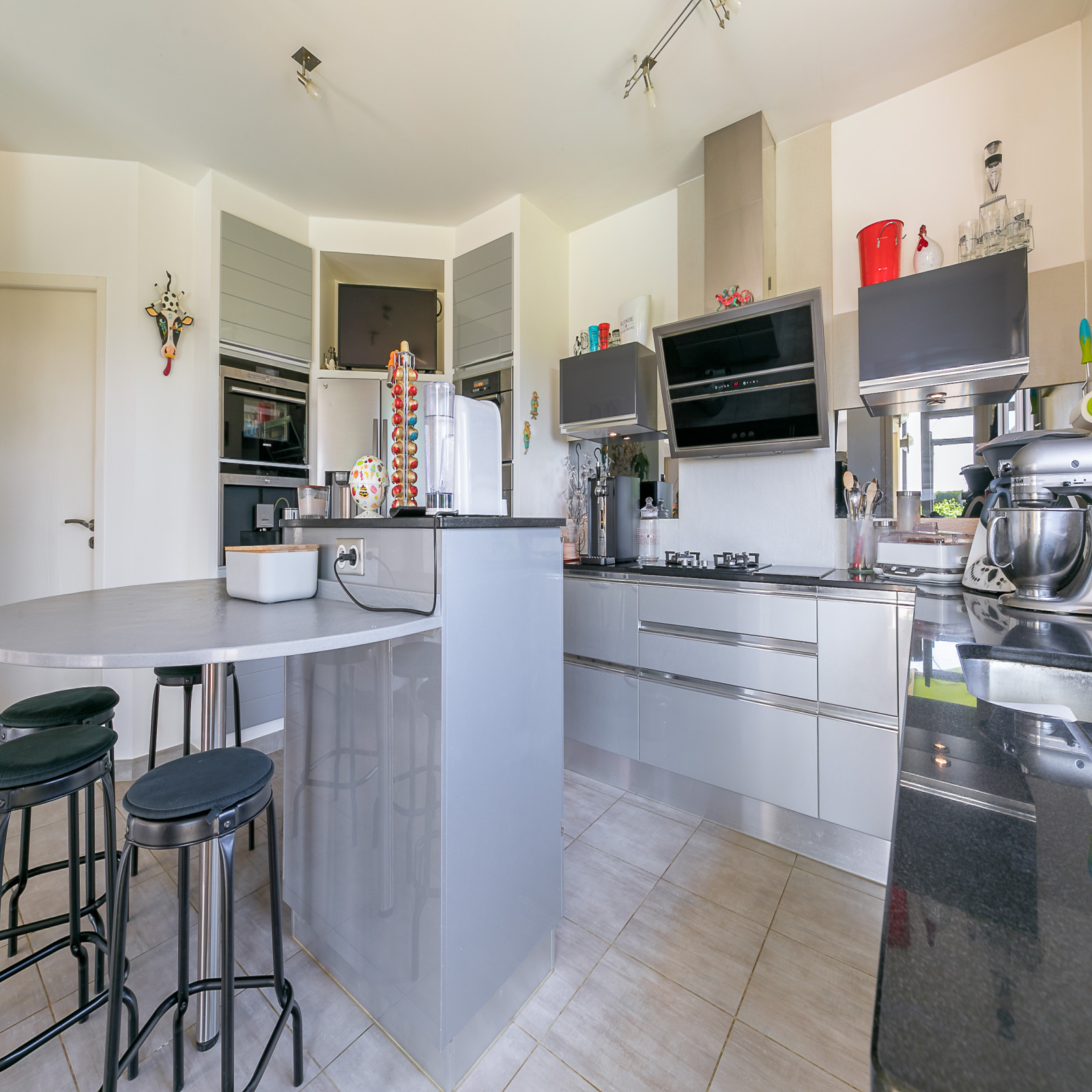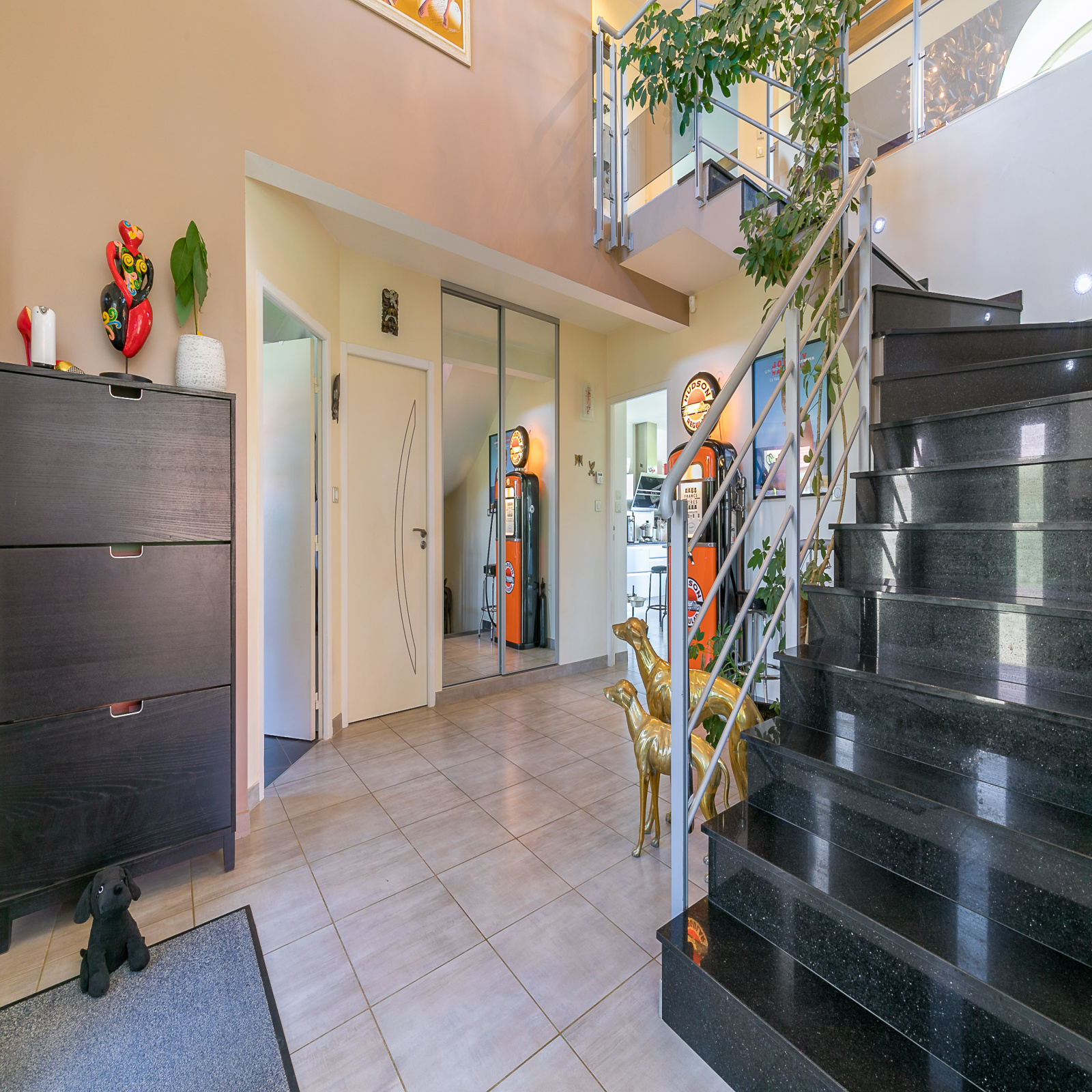 - au RDC: une pièce de vie de 73m² triple exposition avec cuisine ouverte aménagée et équipée haut de gamme (plans en granit, four vapeur, machine à café intégrée...), un grand hall d'entrée, une chambre avec salle d'eau, un wc et un cellier.