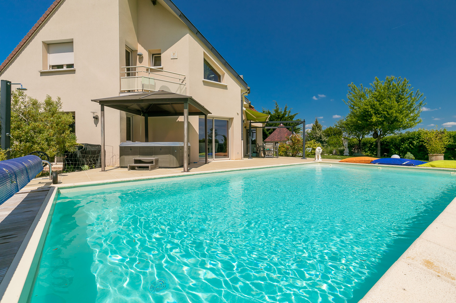 A l'exterieur, vous profiterez d'un terrain cloturé et arboré de plus de 1000m² agrémenté d'une piscine 5x10 chauffée avec volet immergé, d'un kota grill finlandais, d'un jacuzzi, d'un petit bassin et de trois espaces terrasse pour profiter du soleil toute la journée.
