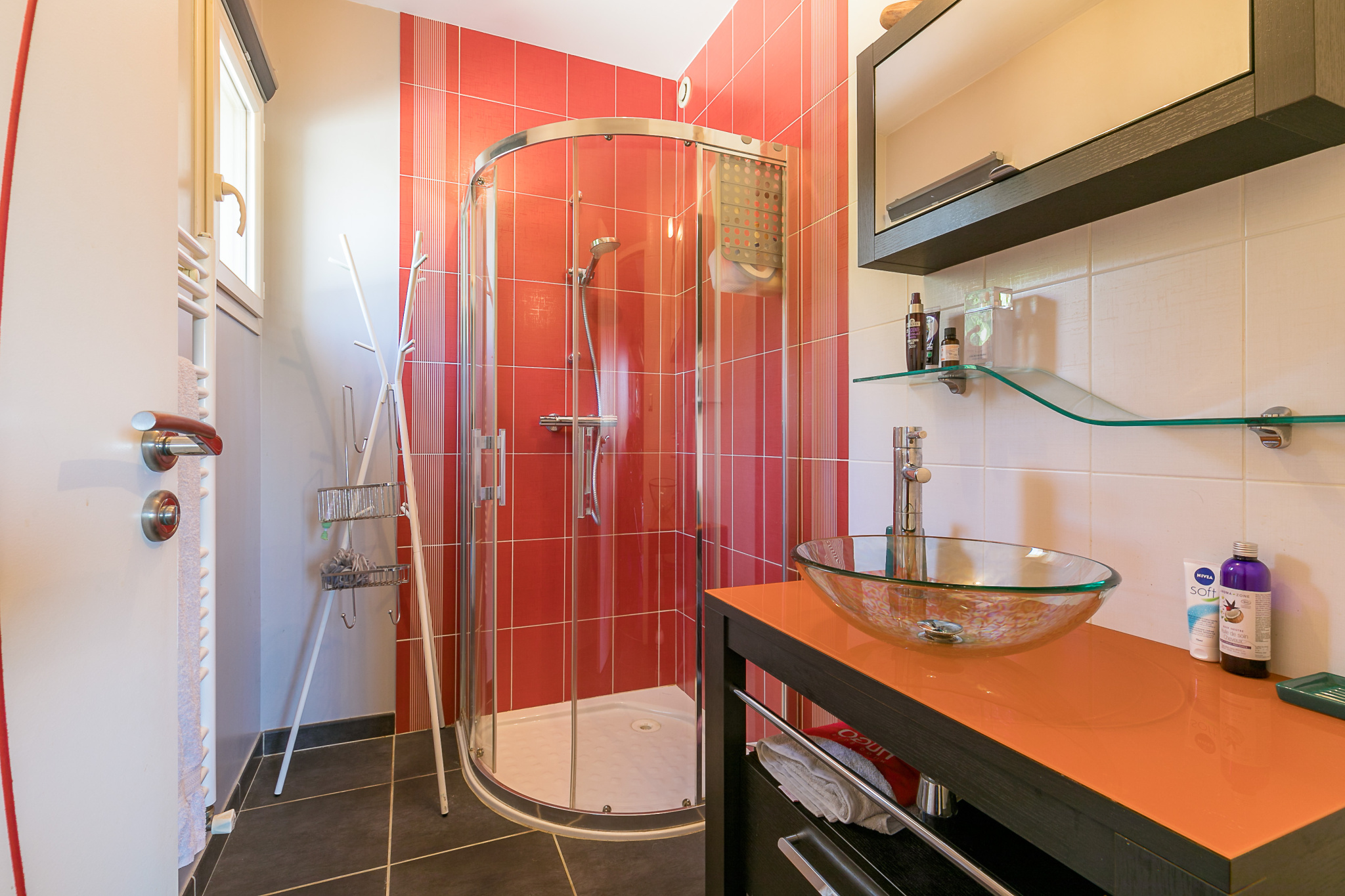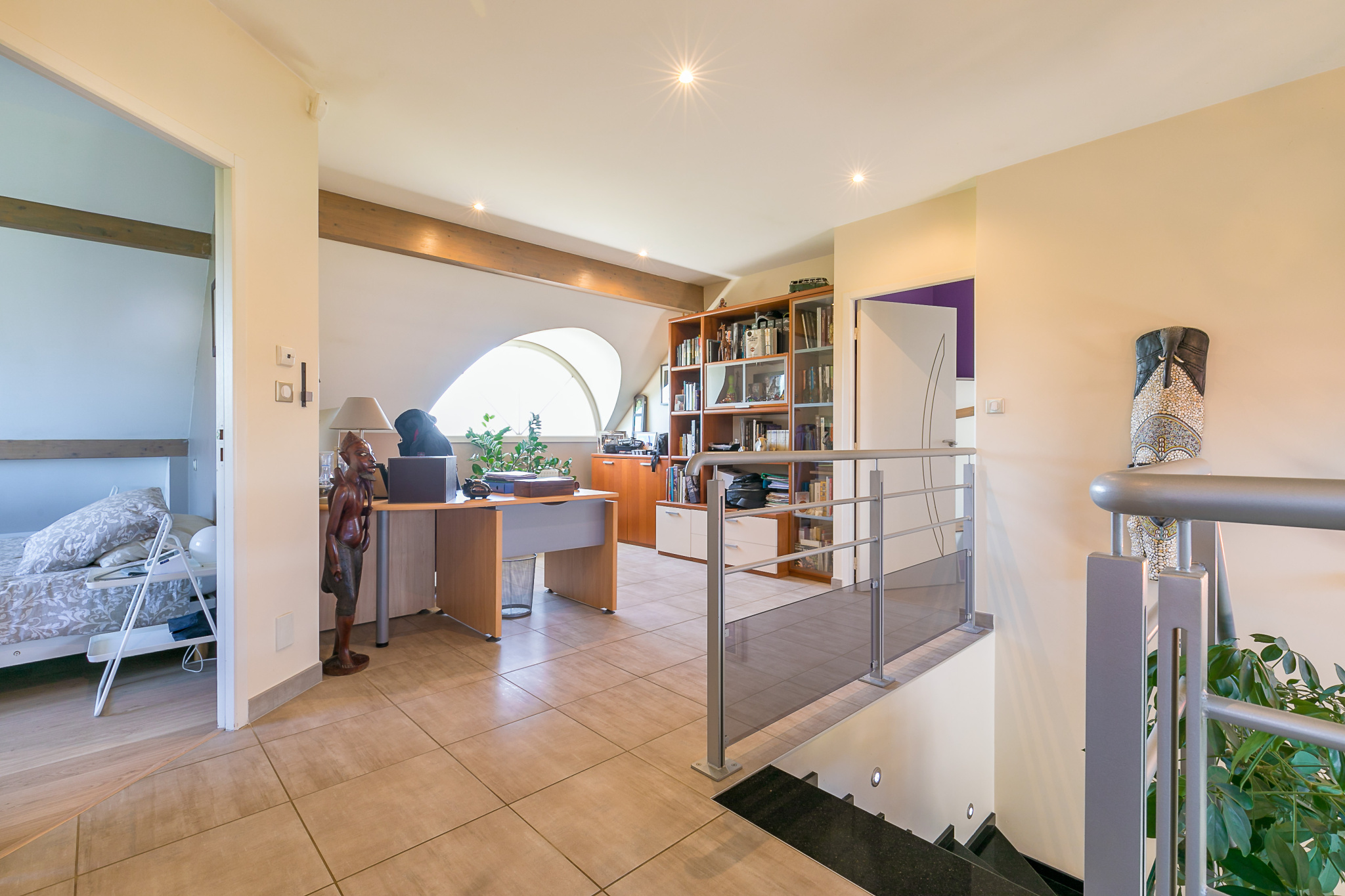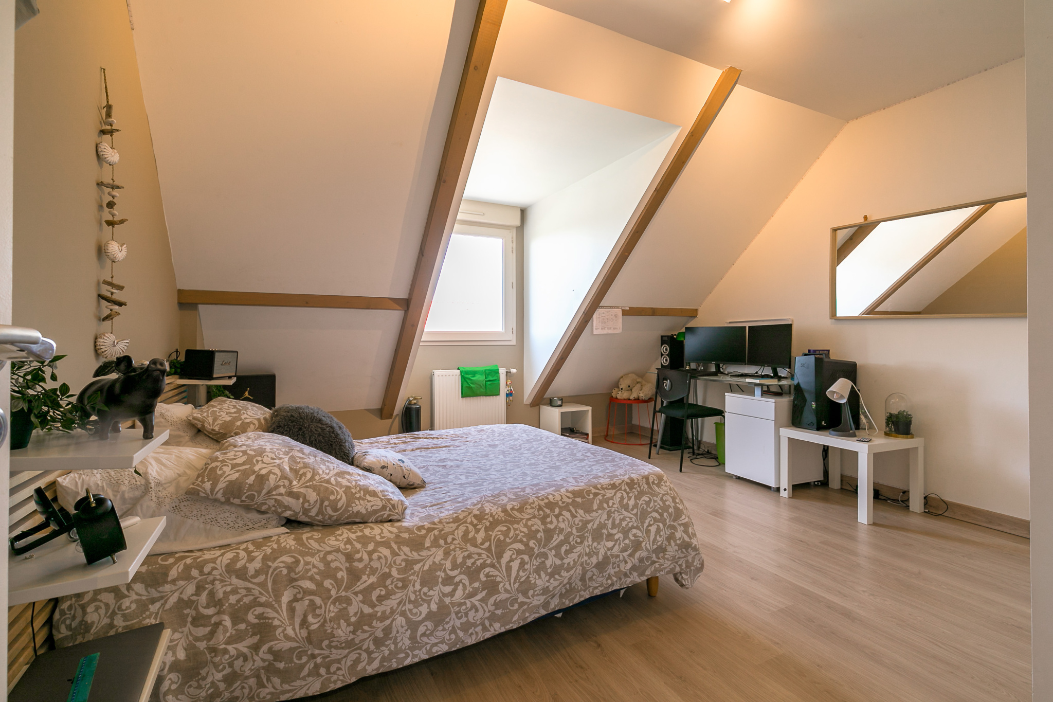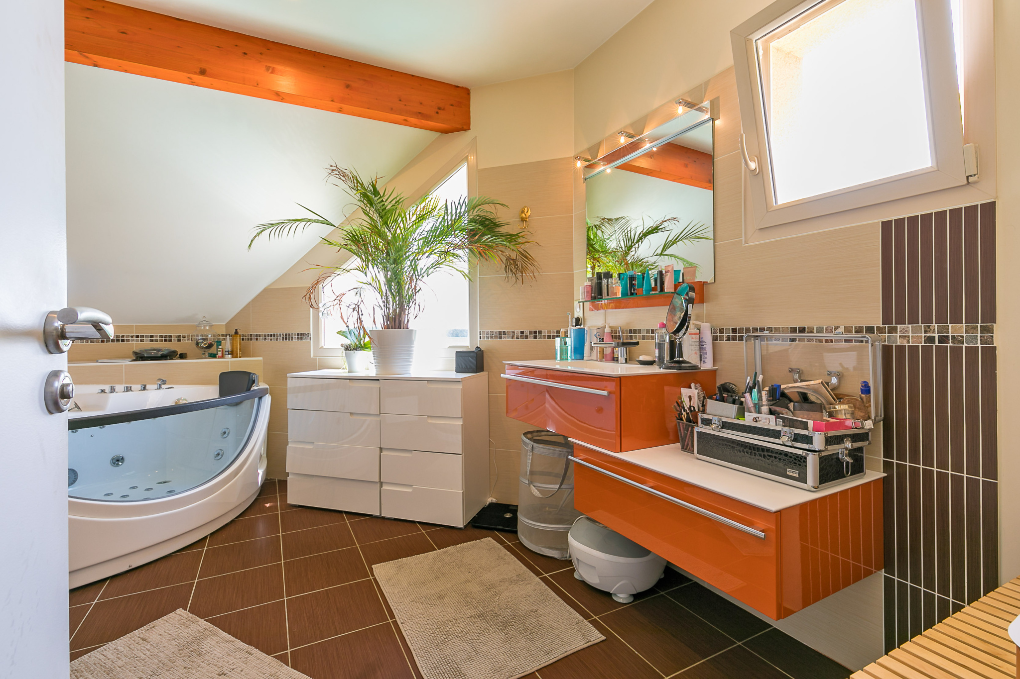 - à l’étage une mezzanine, une suite parentale avec salle de bains (baignoire hydromassante + douche), deux grandes chambres, une salle d’eau et un wc.