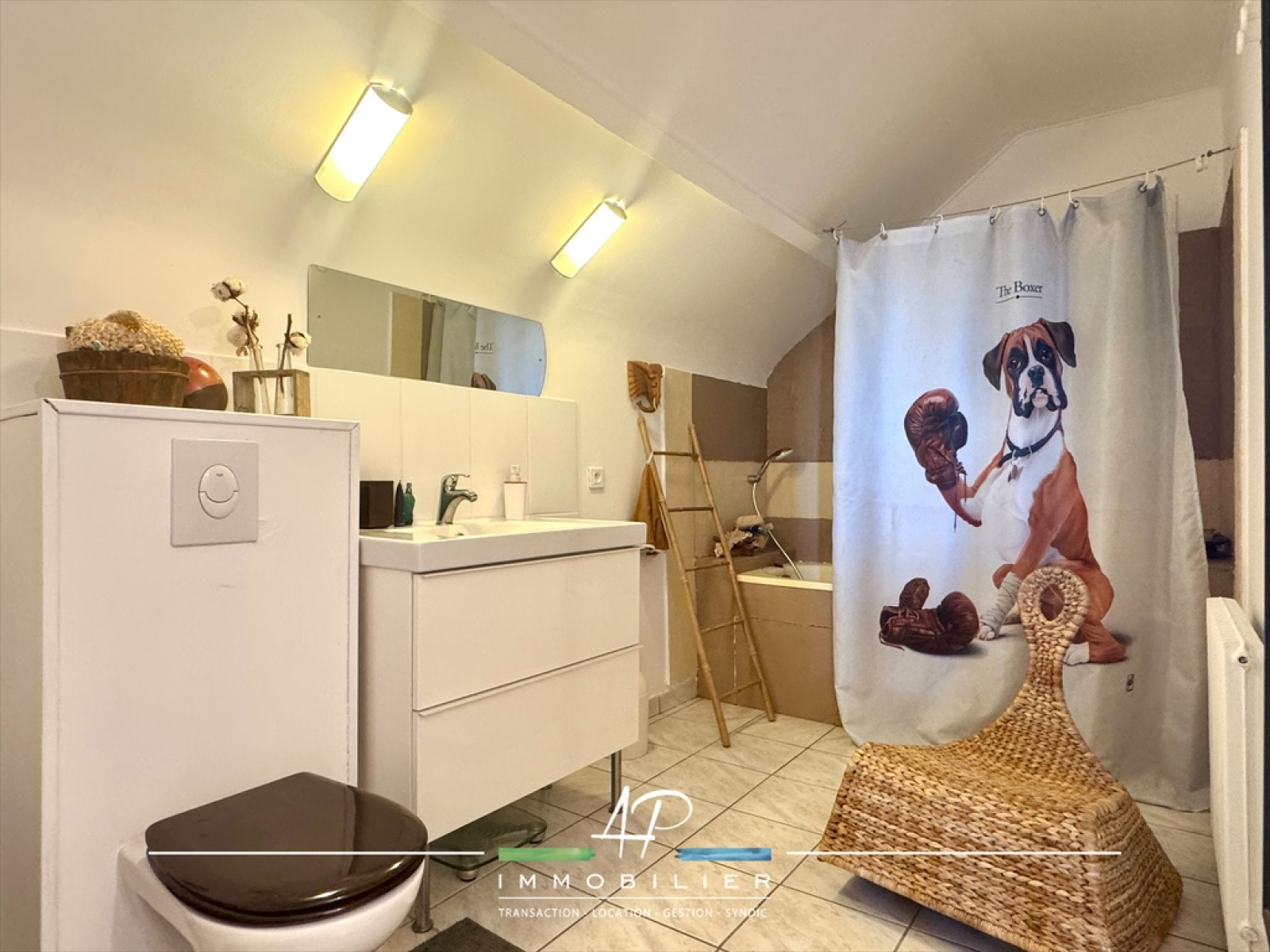 A l'étage: 2 chambres (17,79 m² et 11,34 m²), une salle de bains avec wc, bureau.