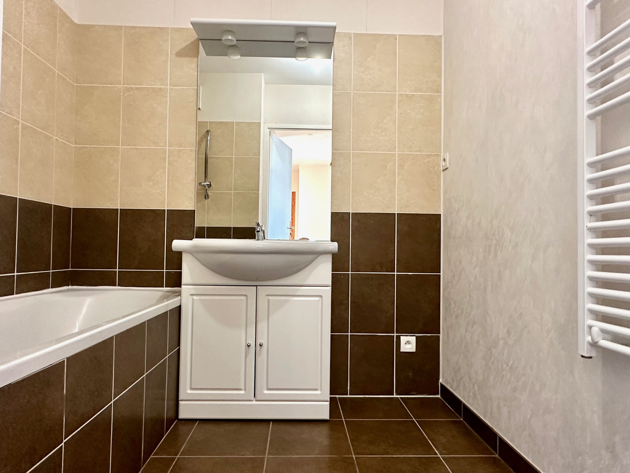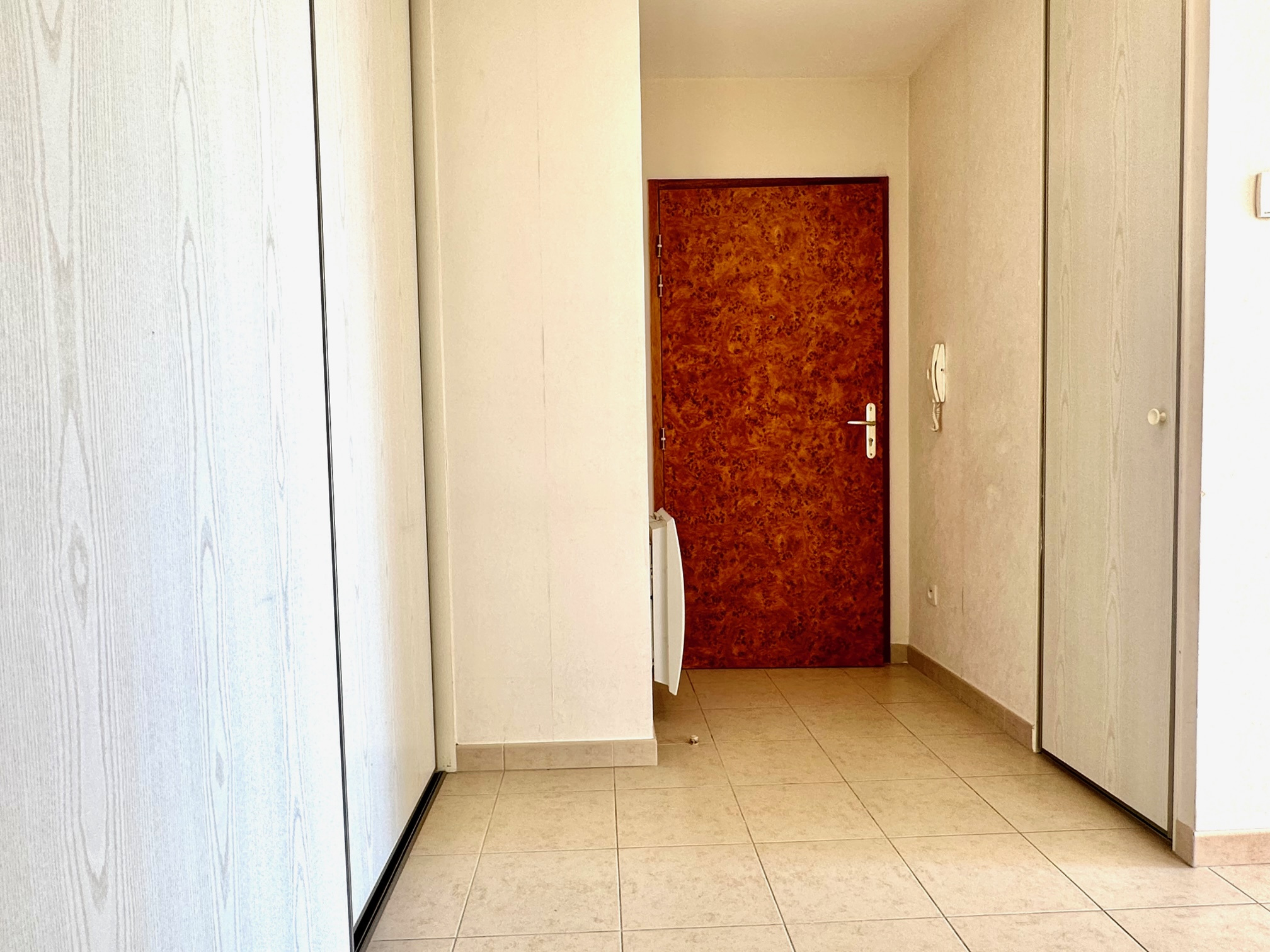 Il est composé d'un dégagement d'entrée avec placard, d'une cuisine et d'un salon donnant sur une terrasse (exposition EST), de deux chambres, d'un wc et d'une salle de bains.