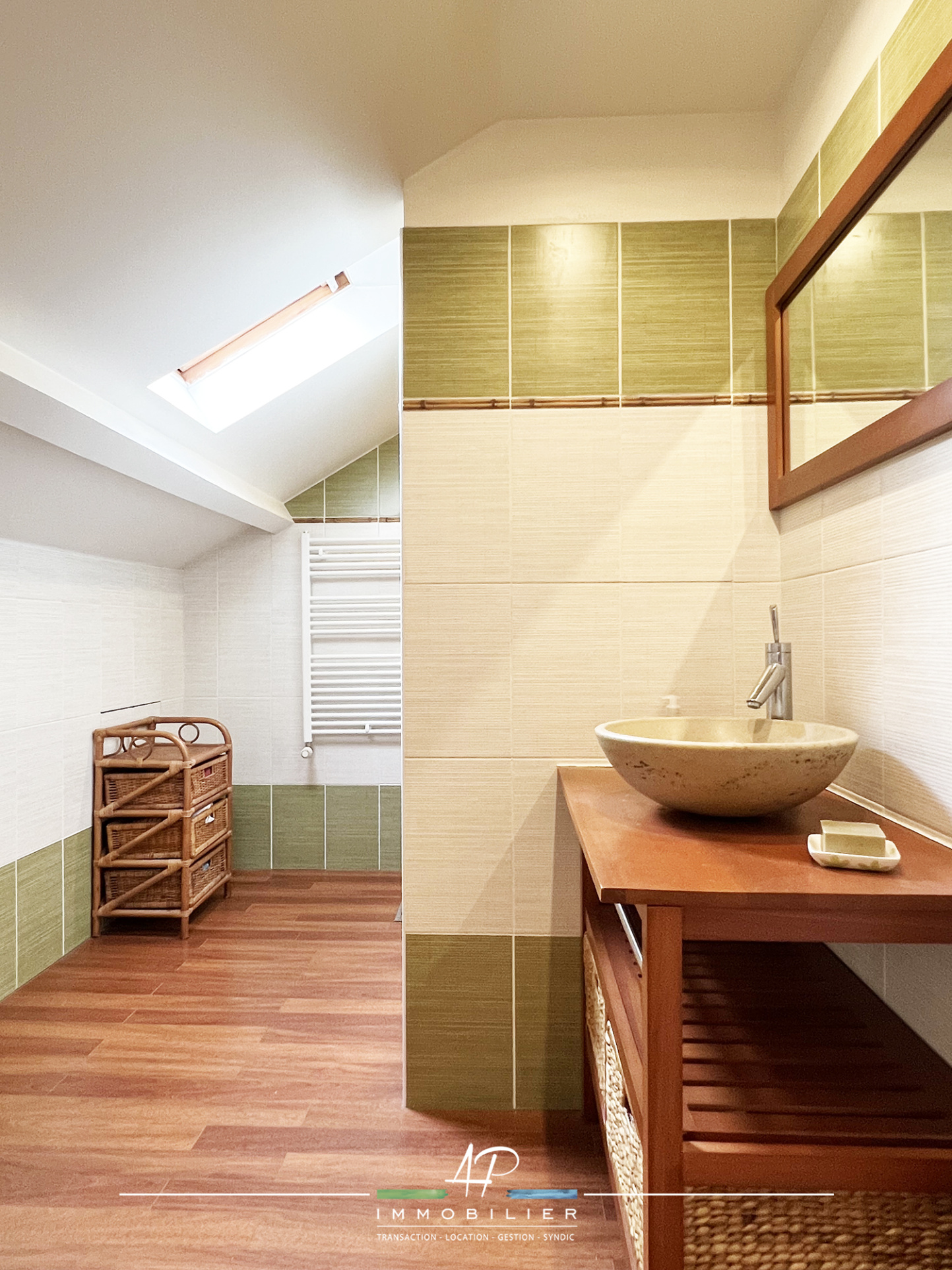 Depuis le séjour et la chambre du RDC, vous accédez à une agréable terrasse exposée sud/ouest (avec store banne motorisé) et un jardin.