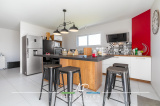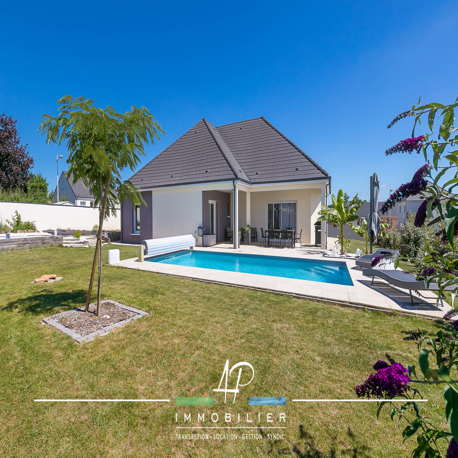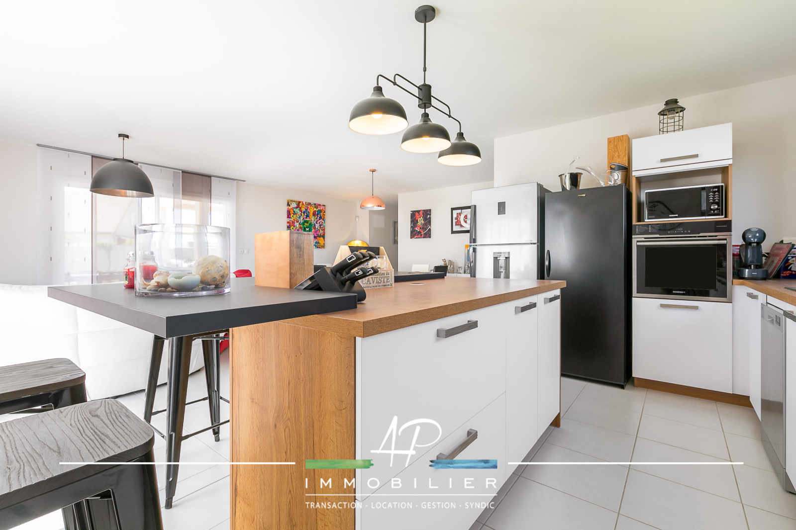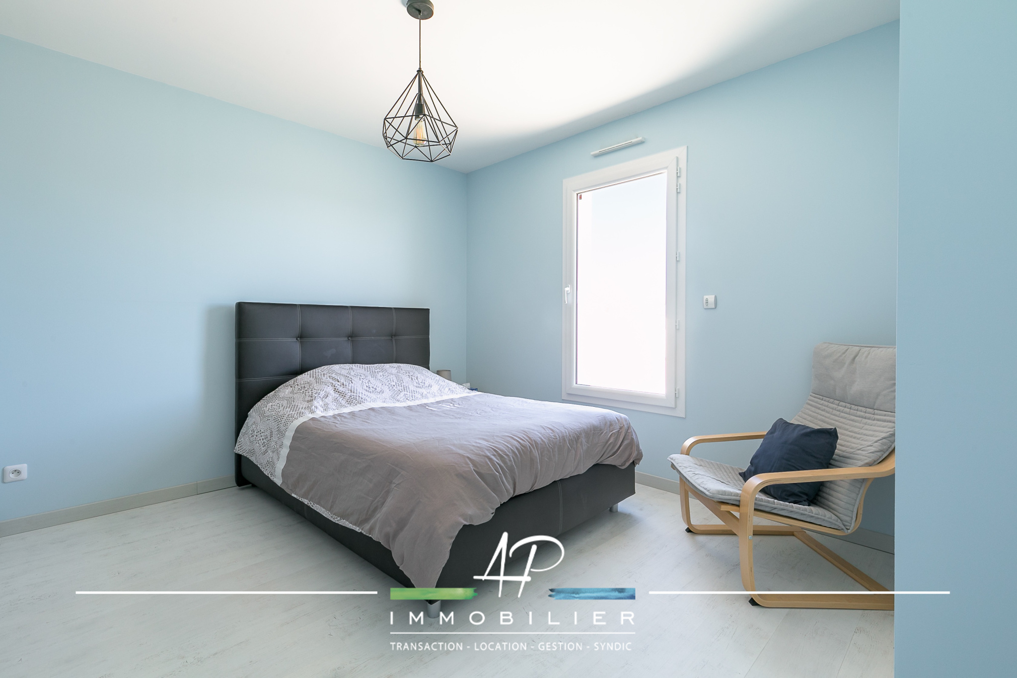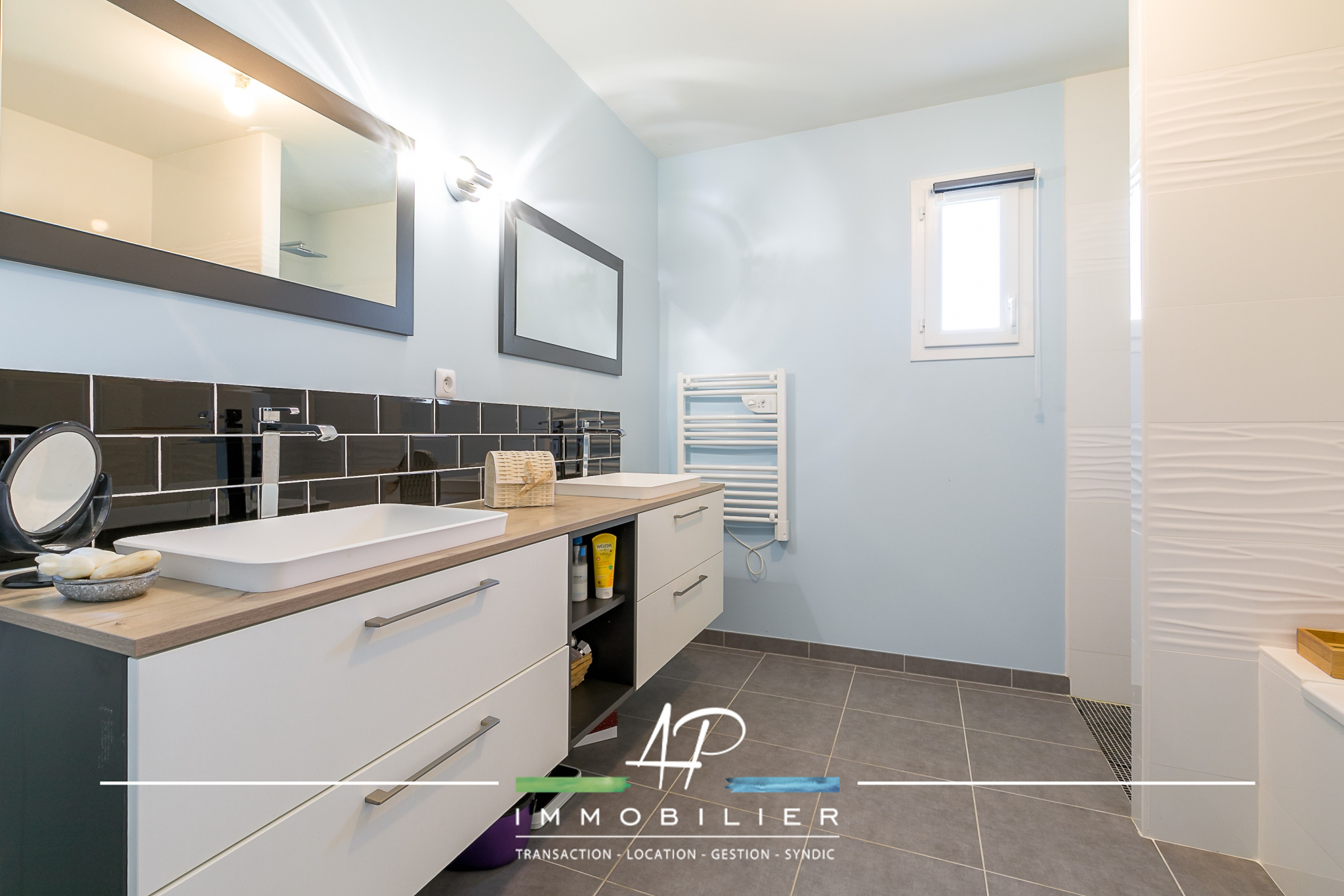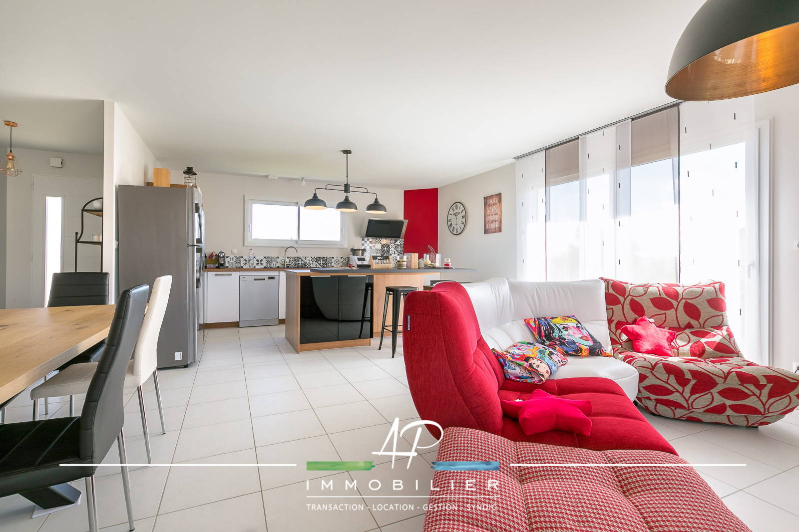 Ce plain-pied de 120 m² habitables dispose: d'une pièce de vie lumineuse de 50m² avec cuisine américaine aménagée et équipée (four, plaques, hotte), d'un cellier/buanderie, de trois chambres dont une suite de 20m² avec dressing aménagé et salle d'eau, d'une salle de bains principale avec douche et baignoire et d'un wc indépendant.