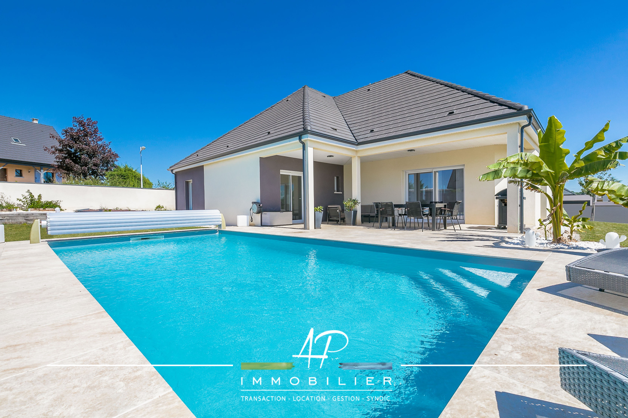 Vous profiterez d'une agréable terrasse semi-couverte exposée sud et donnant sur la piscine 8x4 chauffée (avec volet roulant de protection). Le local technique situé à l'arrière du jardin fait également office de petite dépendance.