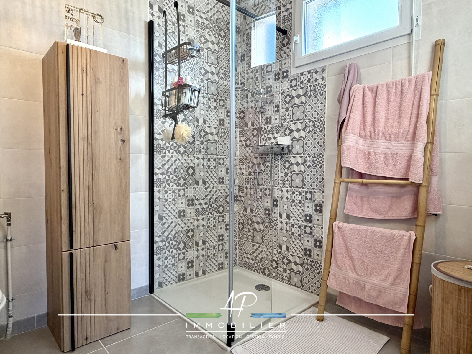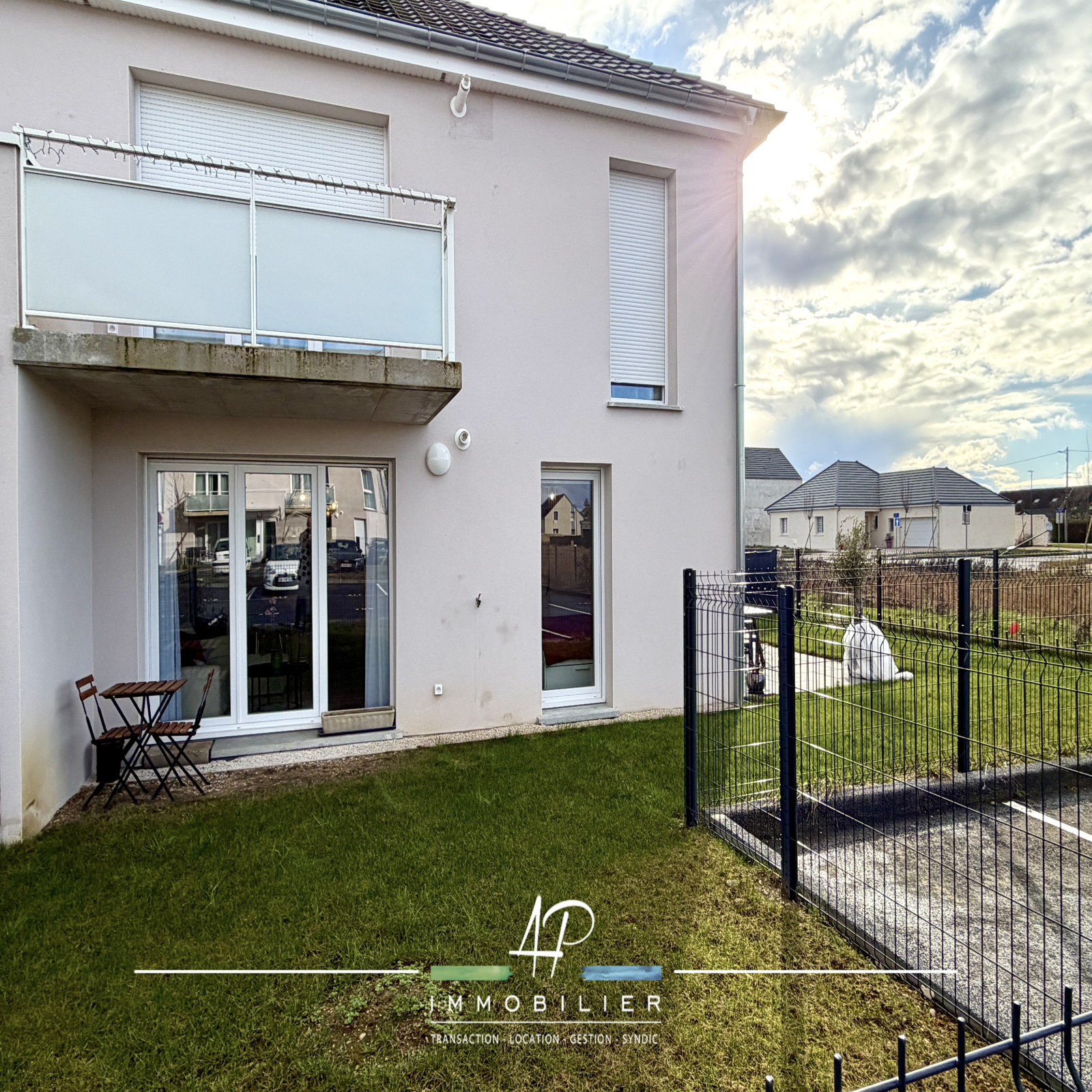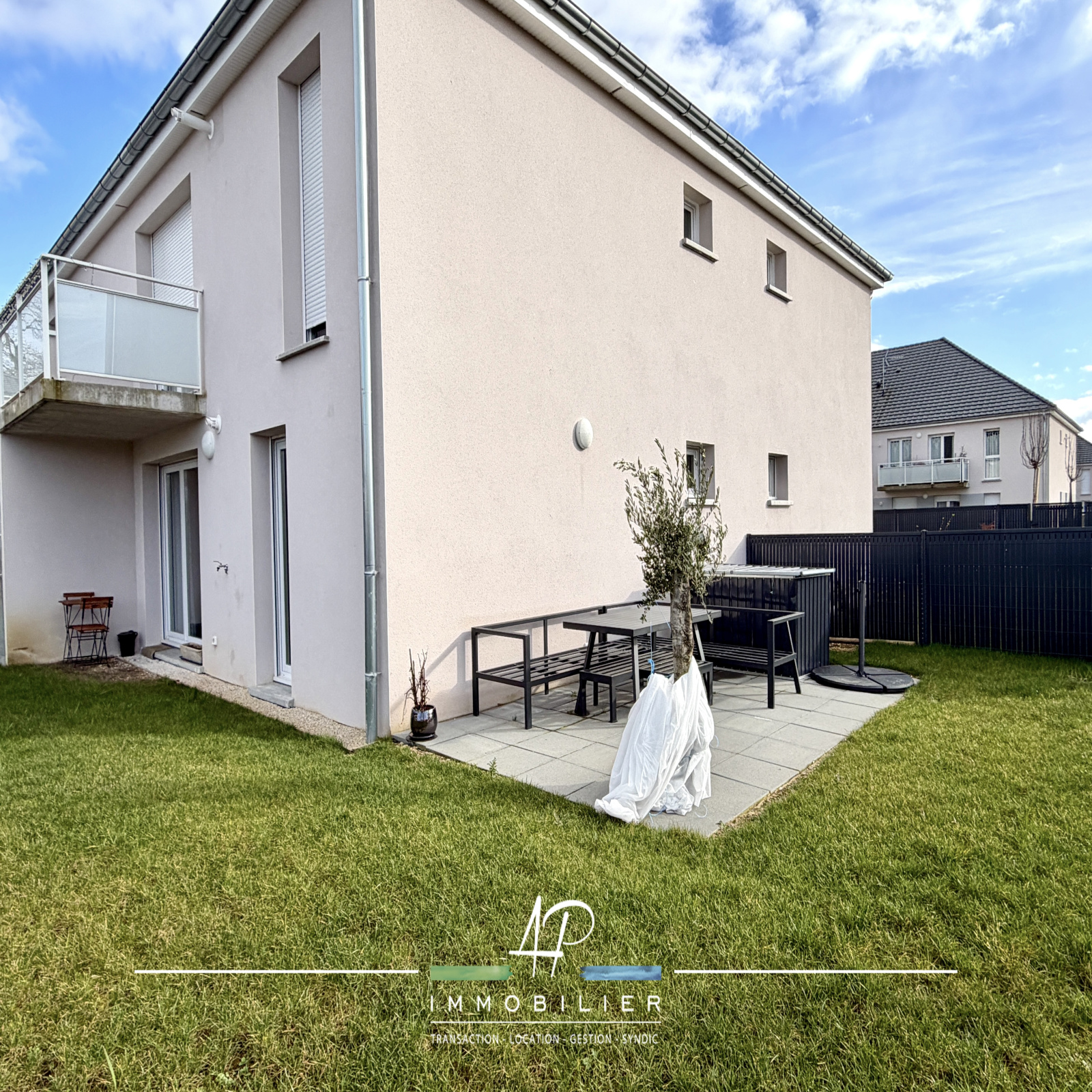 L’entrée s’ouvre sur une pièce de vie lumineuse avec cuisine équipée. Cet espace donne un accès direct à un agréable jardin privatif avec terrasse d’environ 90 m², idéal pour profiter des beaux jours en toute tranquillité.