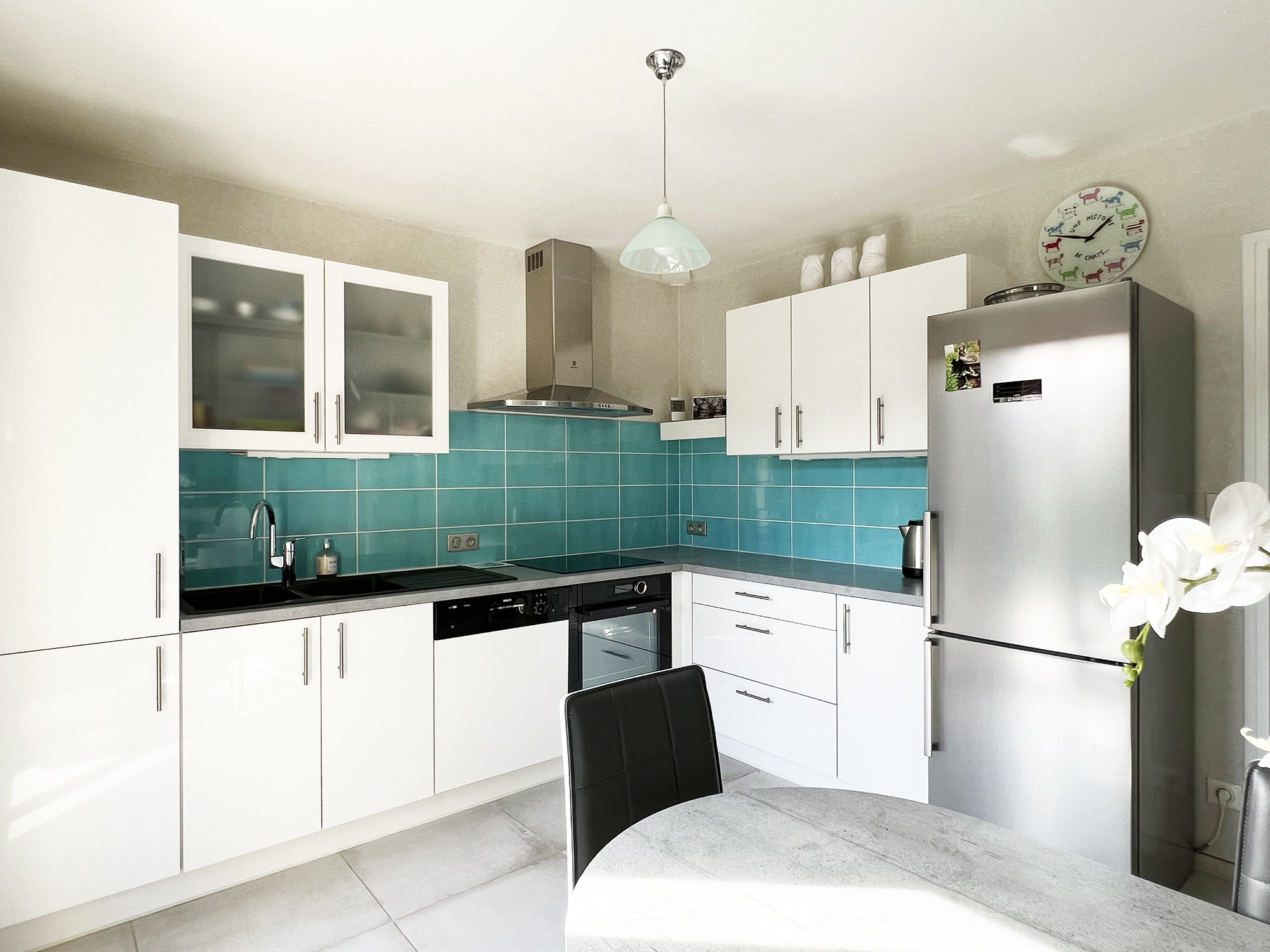 Depuis le séjour et la cuisine, vous accédez à une belle terrasse exposée plein sud (avec stores bannes).