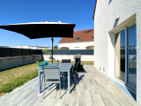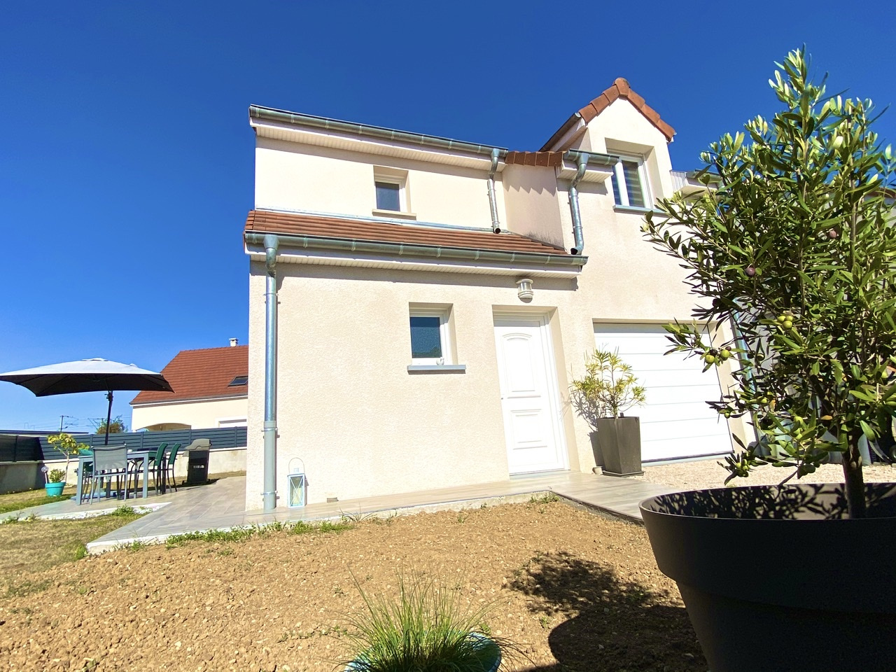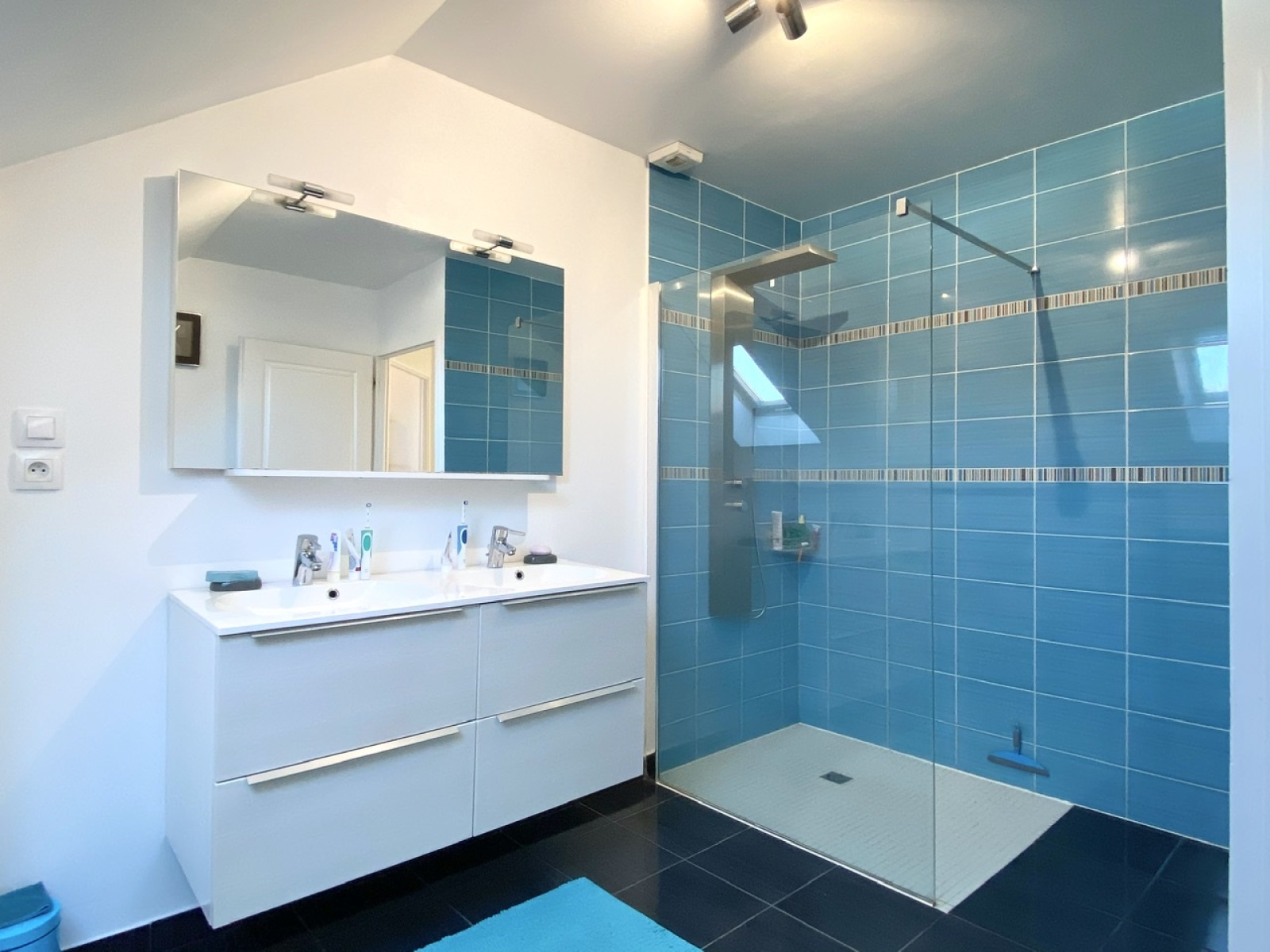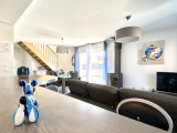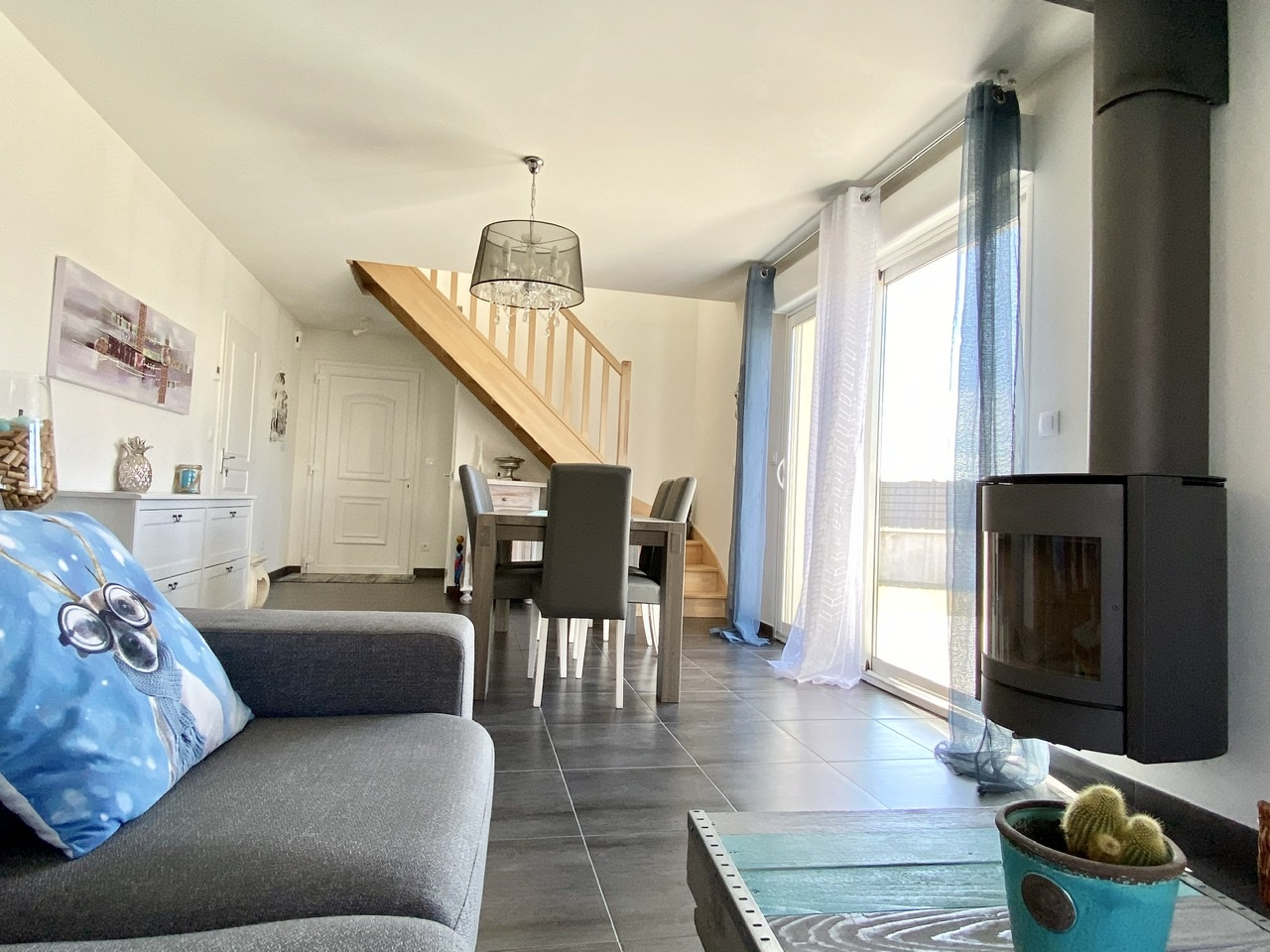 Jolie maison récente (2012) comprenant au rez-de-chaussée une pièce de vie de 40m² avec cuisine ouverte aménagée et équipée, un grand wc avec rangements et un accès au garage. A l'étage, le pallier distribue trois belles chambres, une grande salle d'eau (avec douche à l'italienne et double vasques), et un wc indépendant. Vous profiterez du confort du chauffage au bois grâce au poele situé dans le salon (appoint par radiateurs électriques) et d'un adoucisseur d'eau.