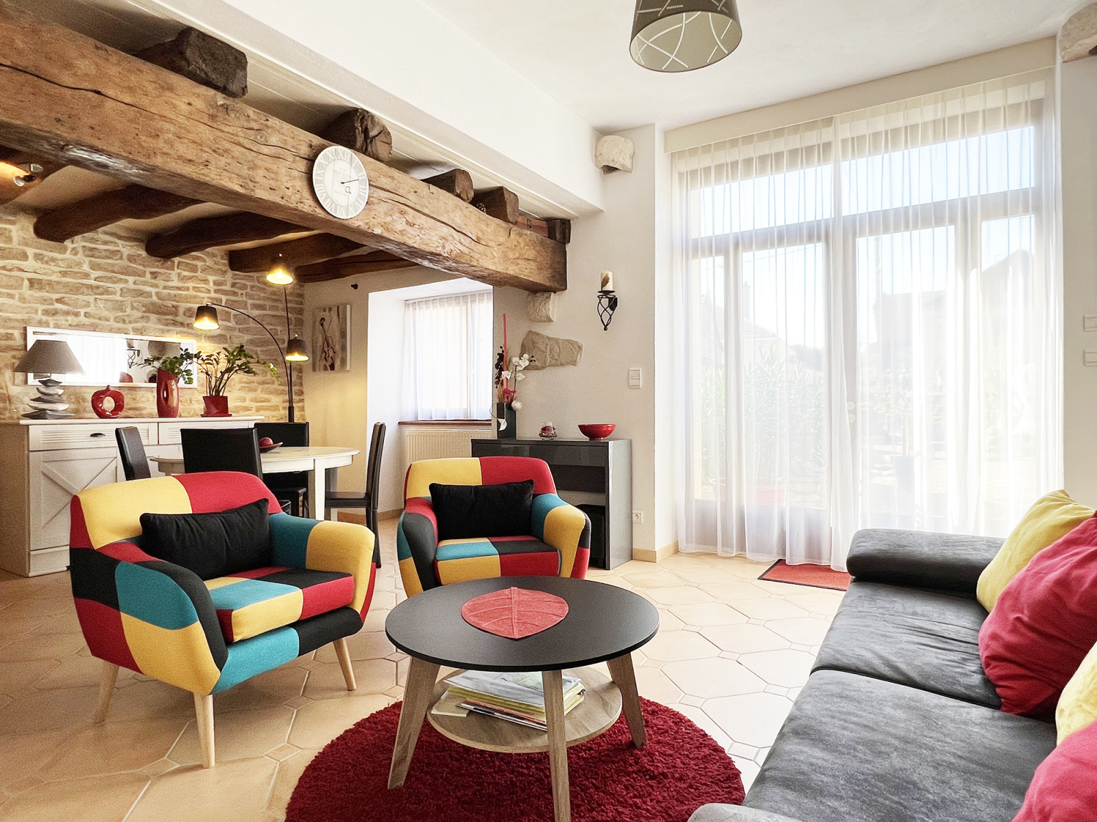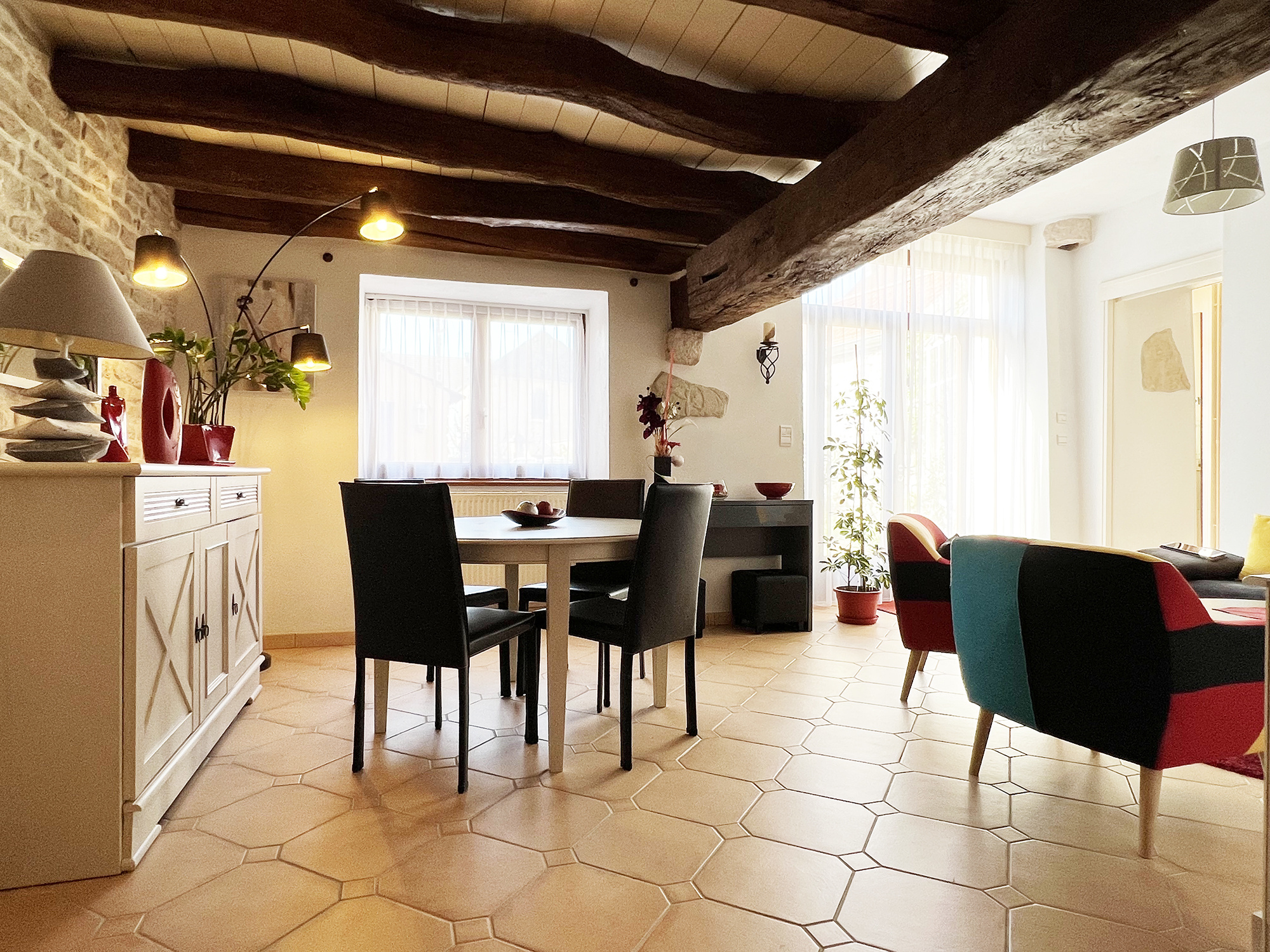 Au cœur du village de COMBLANCHIEN, poussez le portail et pénétrez dans un paisible espace clos, à l’abri des regards. Vous découvrirez une maison pleine de charme qui vous ravira par ses pierres apparentes, ses poutres et sa dépendance.