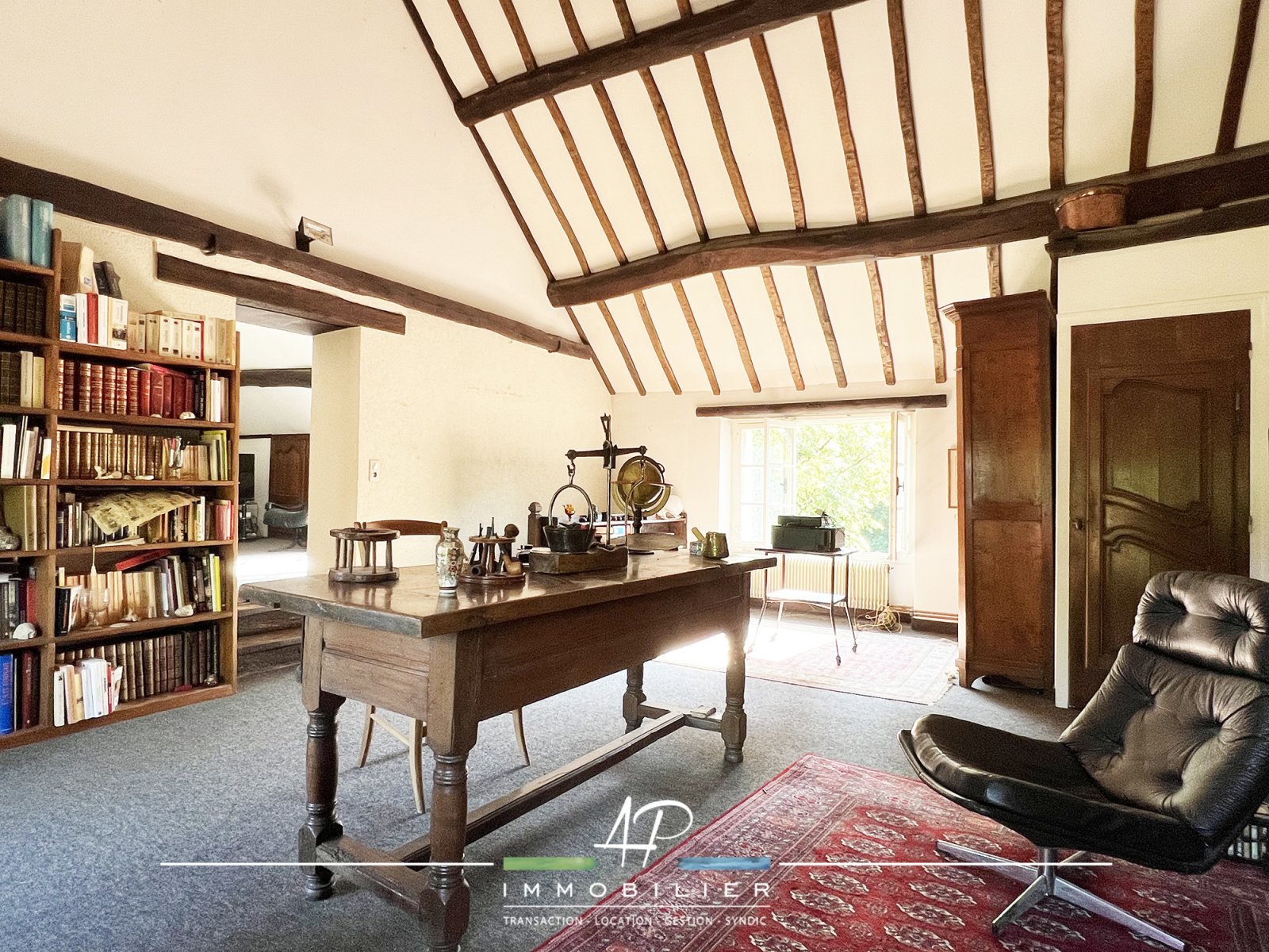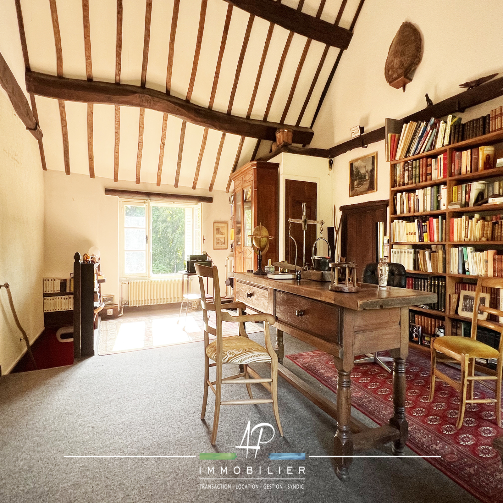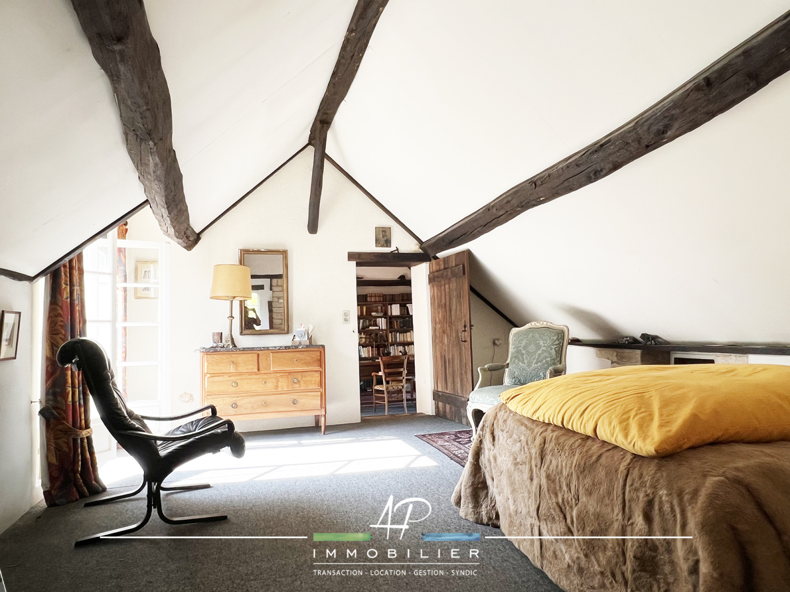 A l’étage, vous découvrirez un bel espace bibliothèque (34m2), donnant accès à deux chambres en enfilade (chacune d’environ 25m2 au sol) et un cabinet de toilette.