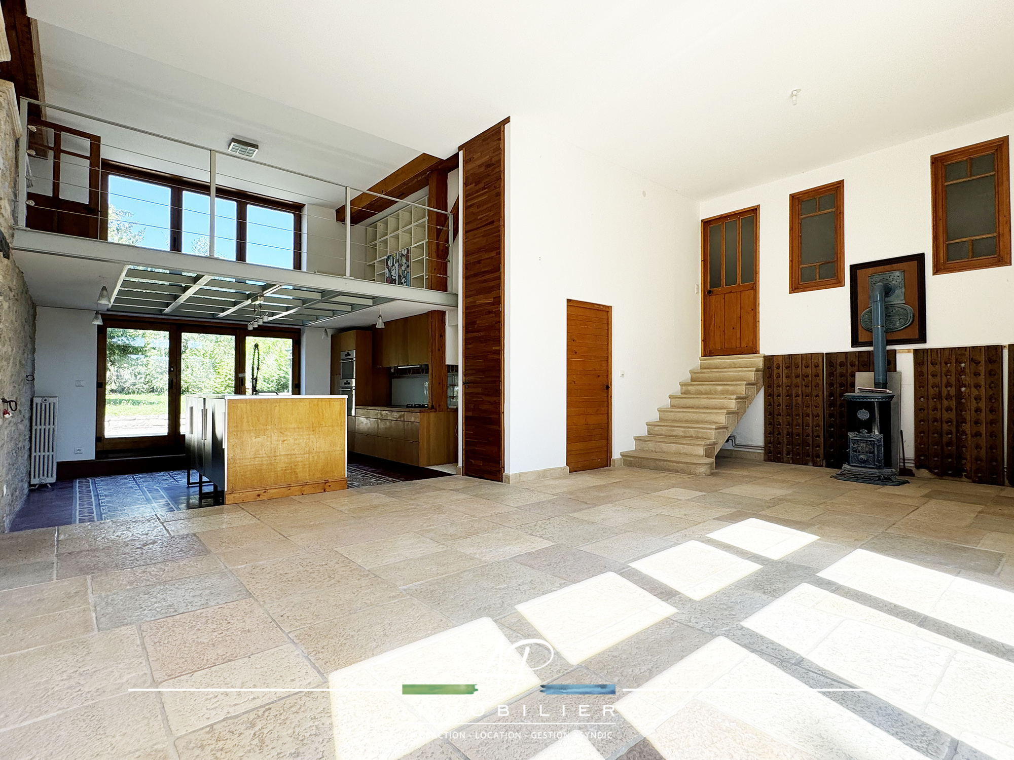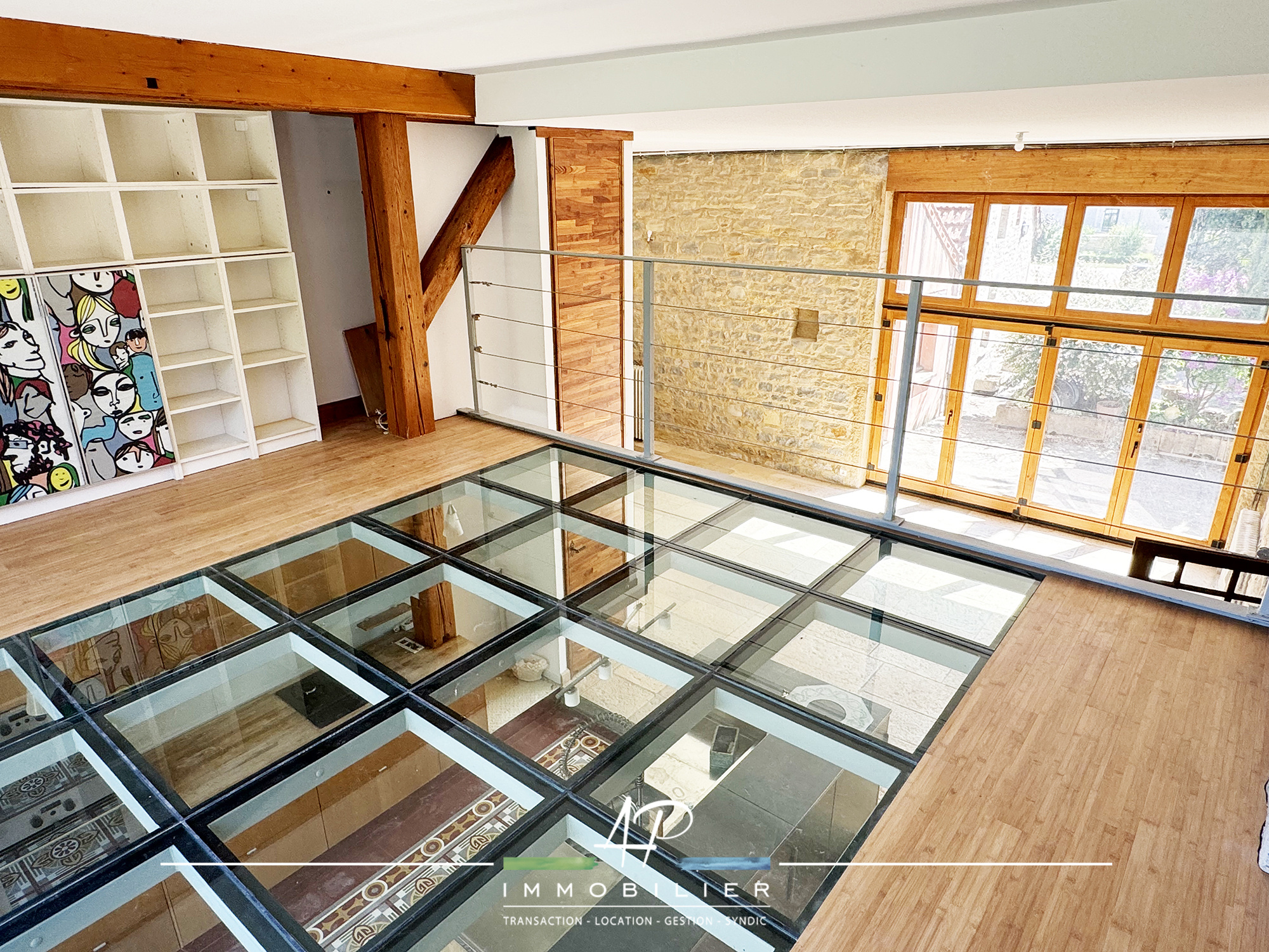 Sur le plancher de verre de la mezzanine, vous pourrez flâner et apprécier la vue sur la pièce de vie et le jardin. Au grès de vos envies, vous profiterez des terrasses exposées nord-est et sud-ouest et du barbecue extérieur. Une dépendance (65m2) accueille un espace atelier/chaufferie et un grand garage.
