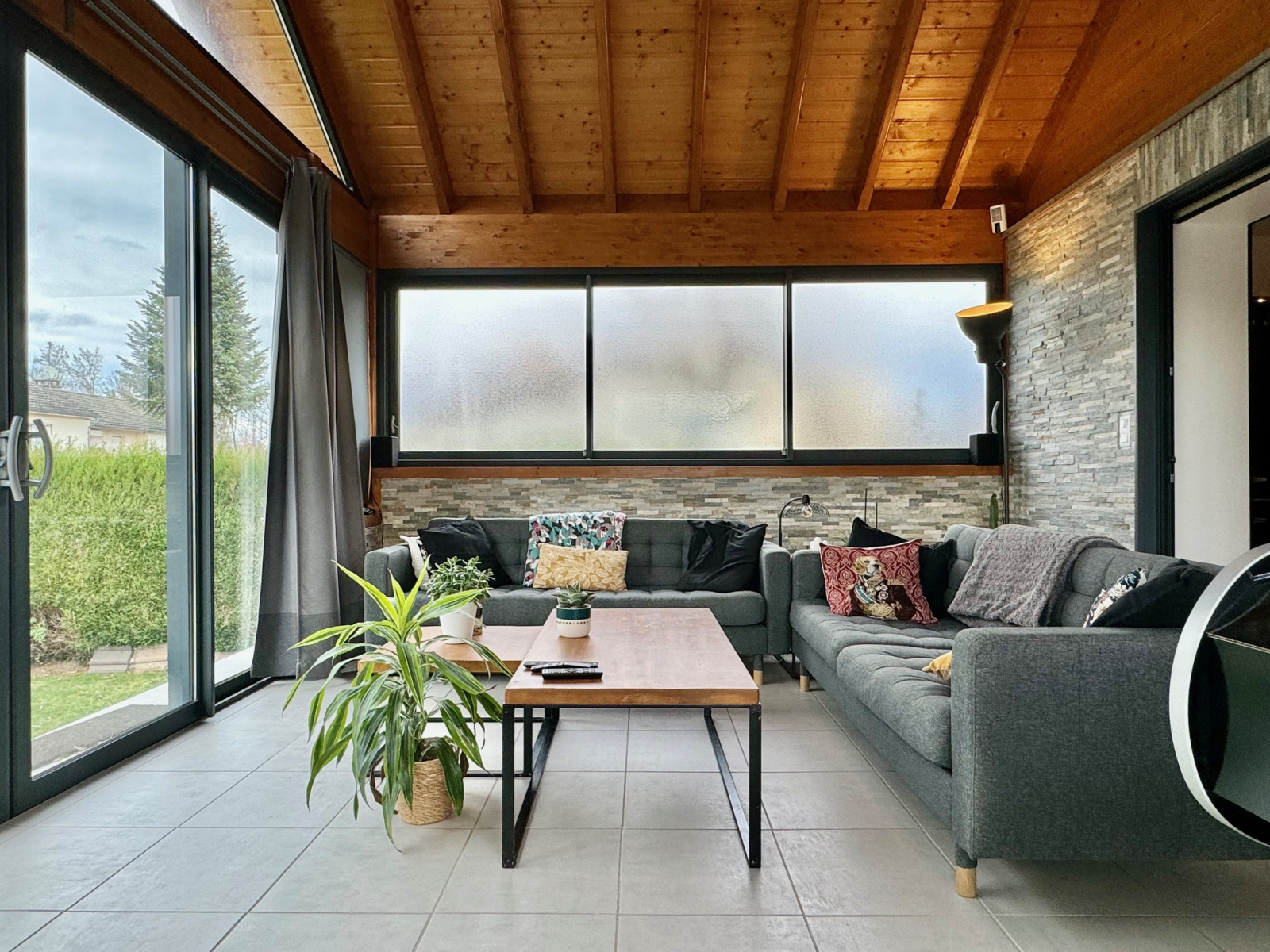 La maison est composée d'une superbe pièce à vivre de 55 m² avec cuisine équipée neuve donnant sur une terrasse et la véranda (25m²), 3 chambres, salle de bains, wc.
